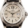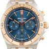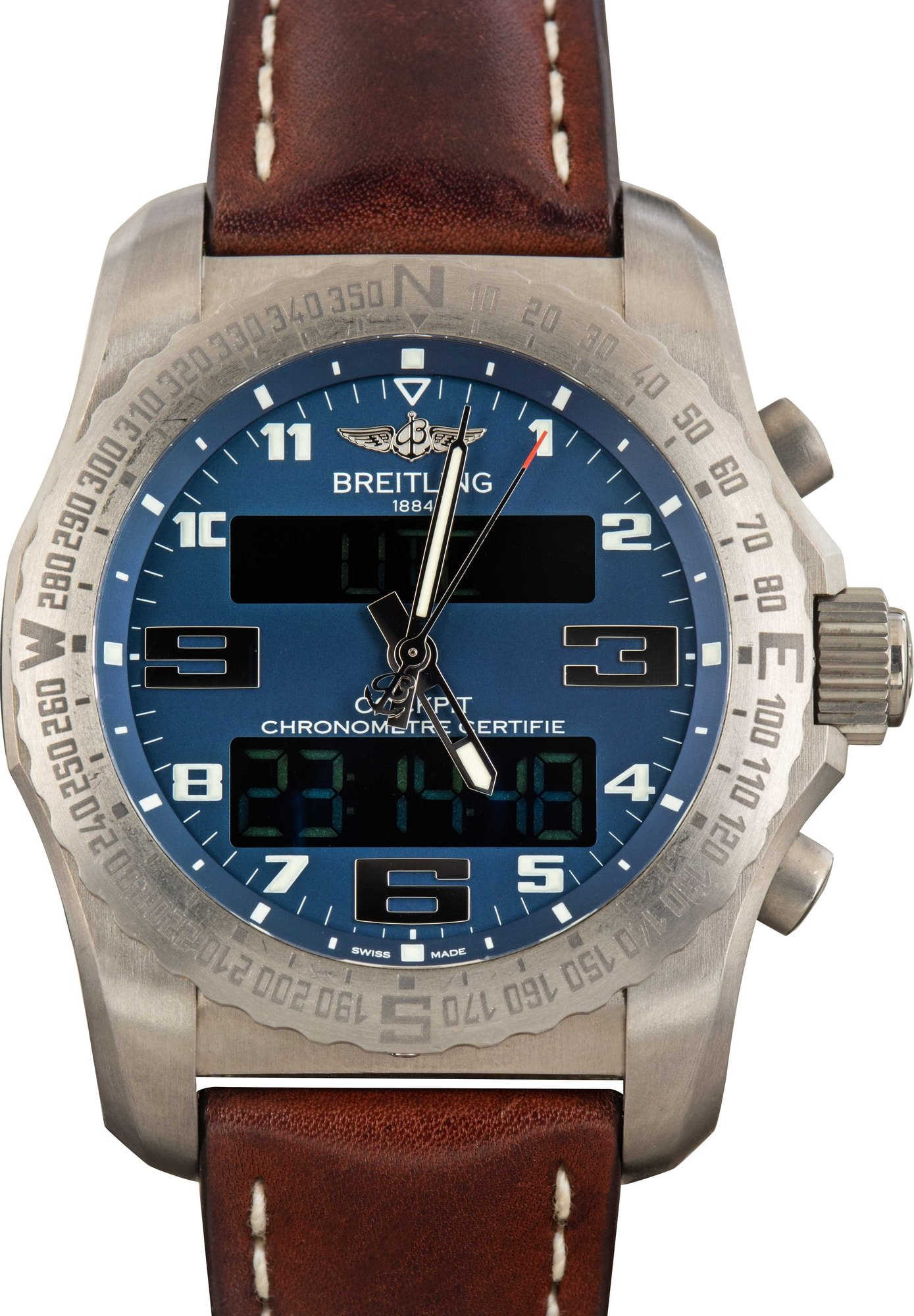 This Breitling Cockpit B50 ref. EB501019/C904 (2016) features a bold 46mm titanium case paired with a brown leather strap, offering a blend of durability and comfort. The blue Arabic dial includes a multifunction digital display, designed for aviators with features such as a chronograph, countdown timer, and dual time zones. A compass slide rule bezel adds navigation functionality, while the SuperQuartz movement provides exceptional precision and reliability in demanding conditions.