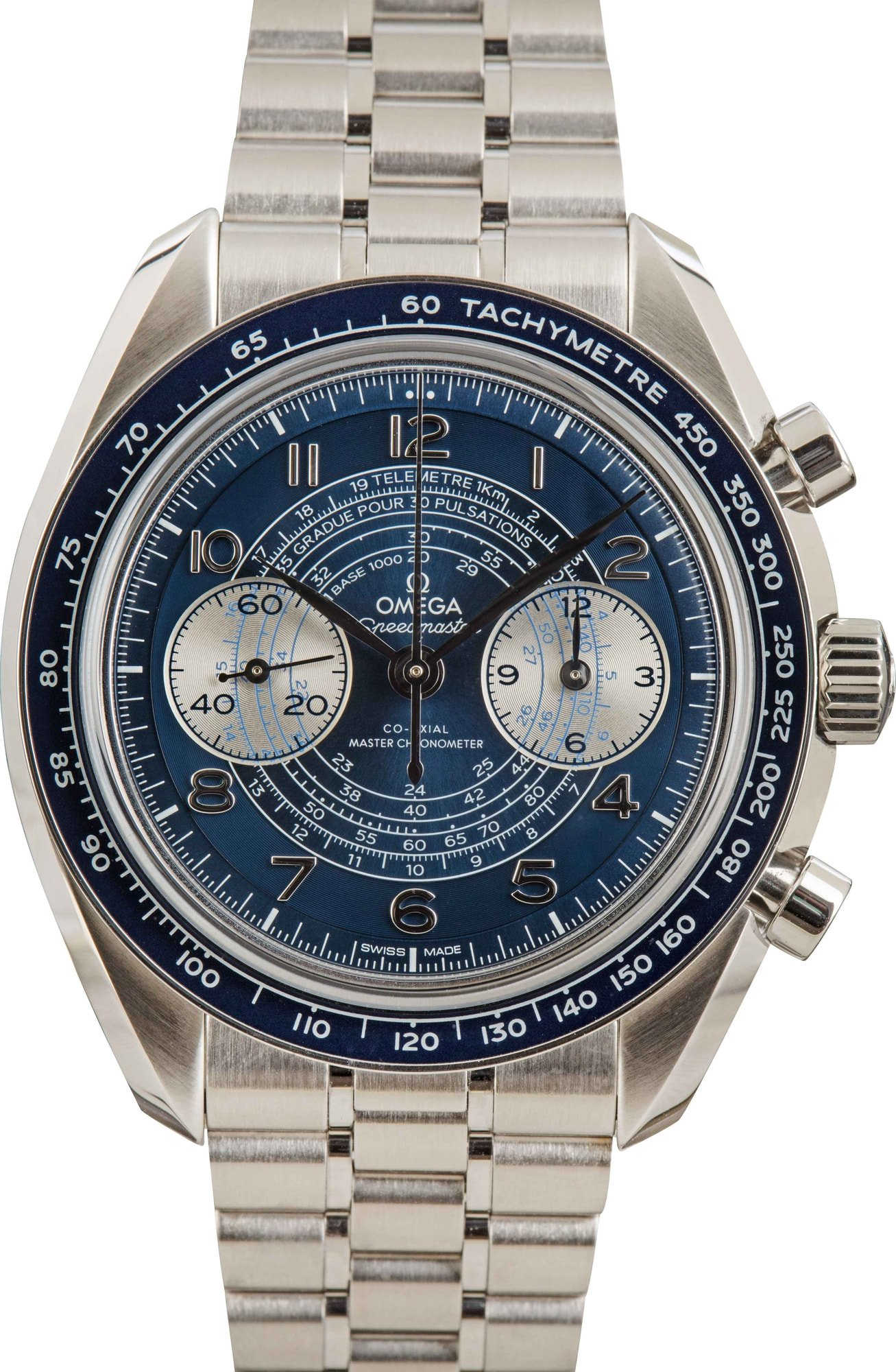 Case Material: Stainless Steel Crystal: Sapphire Size: 43MM Bezel: Aluminum Tachymetric Caseback: Exhibition Serial: 82546XXX Dial: Blue w/ Arabic hour markers, Non-Luminous hands & Nonluminous lume