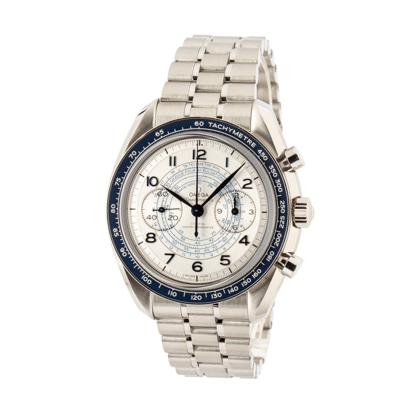 This Omega Speedmaster Chronoscope ref. 329.30.43.51.02.001 combines vintage charm and modern innovation in a 43mm stainless steel case and bracelet. The blue tachymeter bezel frames a silver Arabic dial featuring intricate tachymeter, telemeter, and pulsometer scales alongside two subdials. Powered by the manual-winding Caliber 9908, this timepiece blends precision and classic design for enthusiasts and collectors alike.
