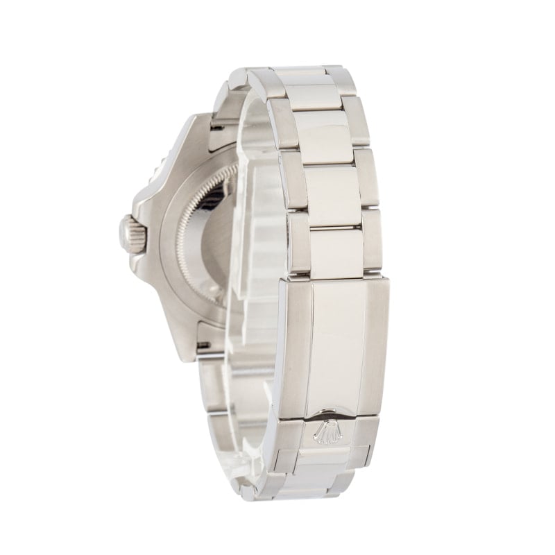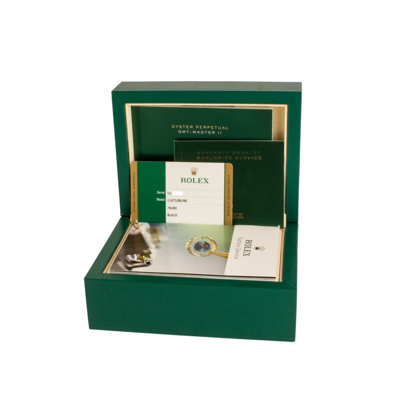 This Rolex GMT-Master II ref. 116710BLNR (2015), famously known as the “Batman,” features a 40mm stainless steel case paired with a black and blue Cerachrom ceramic bezel for tracking dual time zones. Its black dial is equipped with luminous hands and hour markers for optimal legibility, protected by a scratch-resistant sapphire crystal. The Oyster bracelet ensures durability and comfort, while the Rolex Caliber 3186 automatic movement provides precise timekeeping and a 48-hour power reserve. Water-resistant to 100 meters, this GMT-Master II combines iconic design, functionality, and everyday reliability.