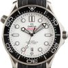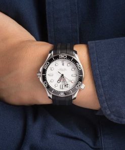 Omega Seamaster Diver 300M ref. 210.32.42.20.04.001 (2023) exudes modern sport-luxury with its 42mm stainless steel case, black ceramic bezel with white enamel diving scale, and polished white ceramic dial with laser-engraved waves and red “Seamaster” detail. Blackened skeleton hands filled with Super-LumiNova and a red-tipped seconds hand add dynamic contrast, while the integrated black rubber strap ensures sleek comfort. Powered by the OMEGA Master Chronometer Calibre 8800, visible through the wave-edged sapphire caseback, this Seamaster blends technical mastery with bold, contemporary style.