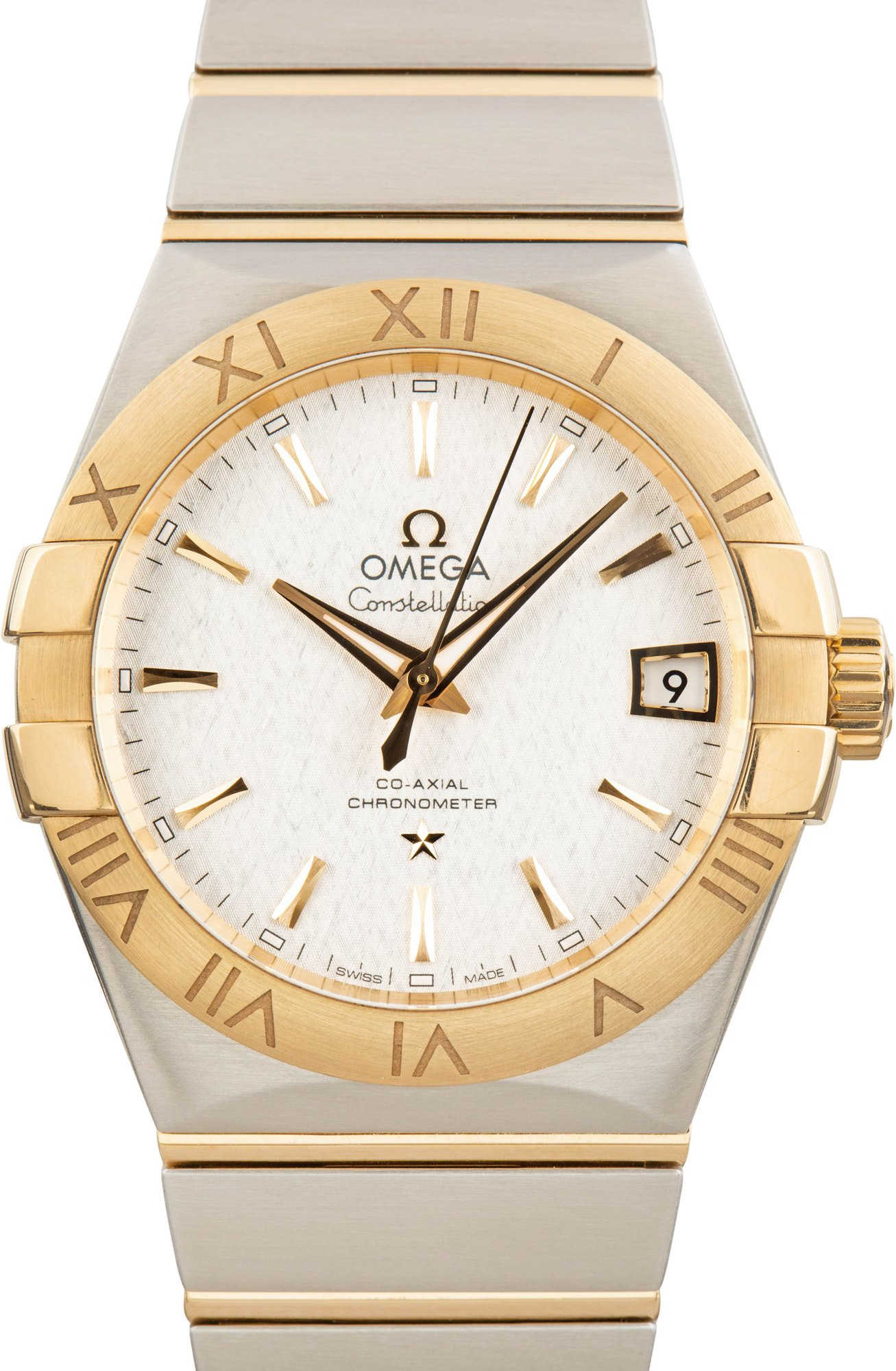 Omega Constellation ref. 123.20.38.21.02.006 features a white opaline-silvery dial with a date window at 3 o’clock and a distinctive silk-like pattern inspired by Constellation models of the 1960s. Its 38mm case combines stainless steel with 18K yellow gold, which is also for the hands, indexes, and polished bracelet bars. Highlighted by the iconic Constellation “claws” and a brushed bezel with tone-on-tone Roman numerals, this timepiece is powered by the OMEGA Co-Axial Calibre 8500, blending classic elegance with precise, reliable performance.