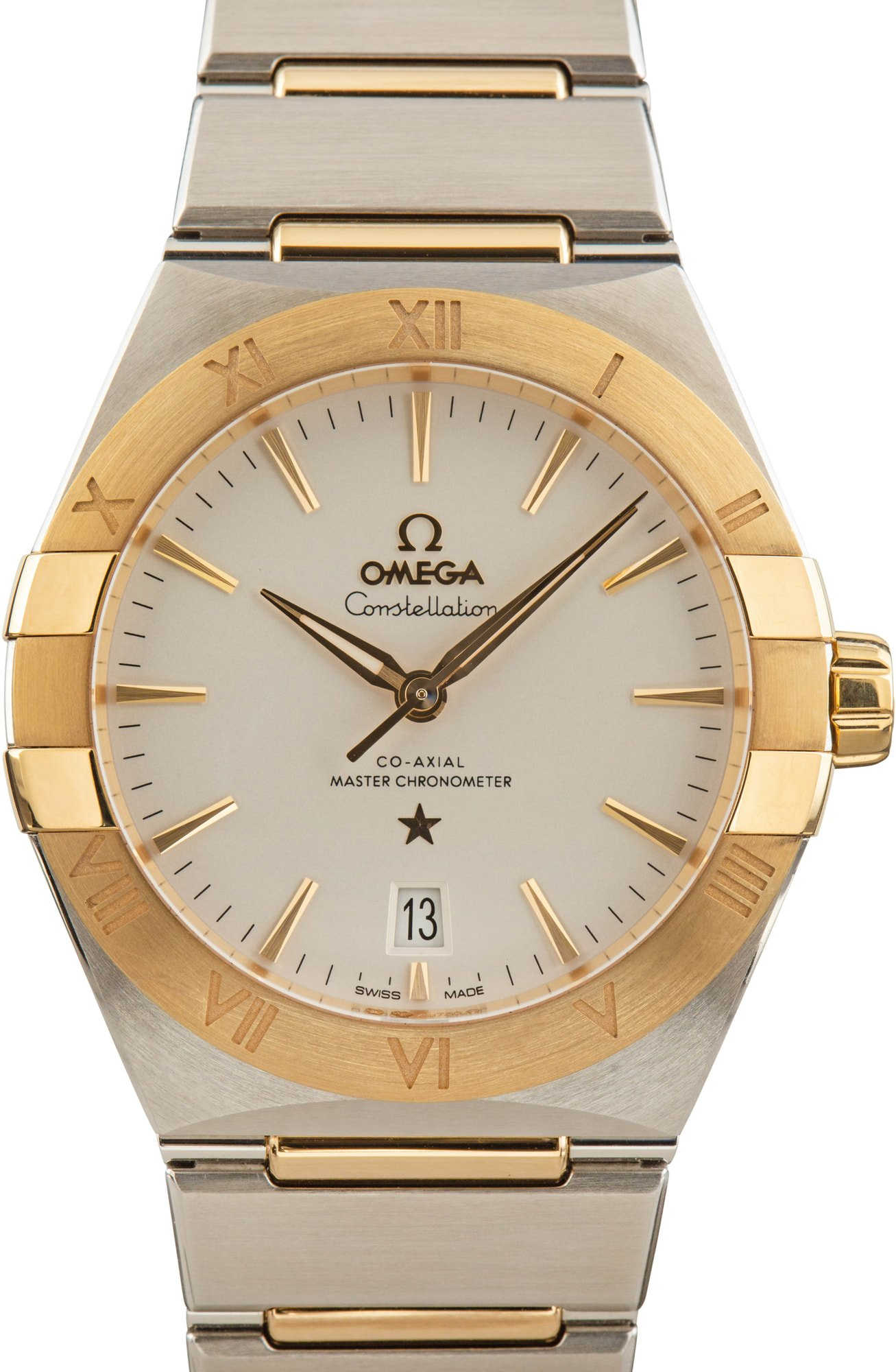 Omega Constellation ref 131.20.39.20.02.002 (2025) pairs stainless steel with 18K yellow gold in a 39mm case topped by a Roman numeral bezel. Its opaline white silvery dial is accented with a 6 o’clock date display, while the hands, hour markers, Constellation star, and OMEGA logo shine in solid 18K yellow gold. A domed sapphire crystal caseback reveals the Co-Axial Master Chronometer Calibre 8800, delivering precision, reliability, and luxury in one of Omega’s most iconic designs.