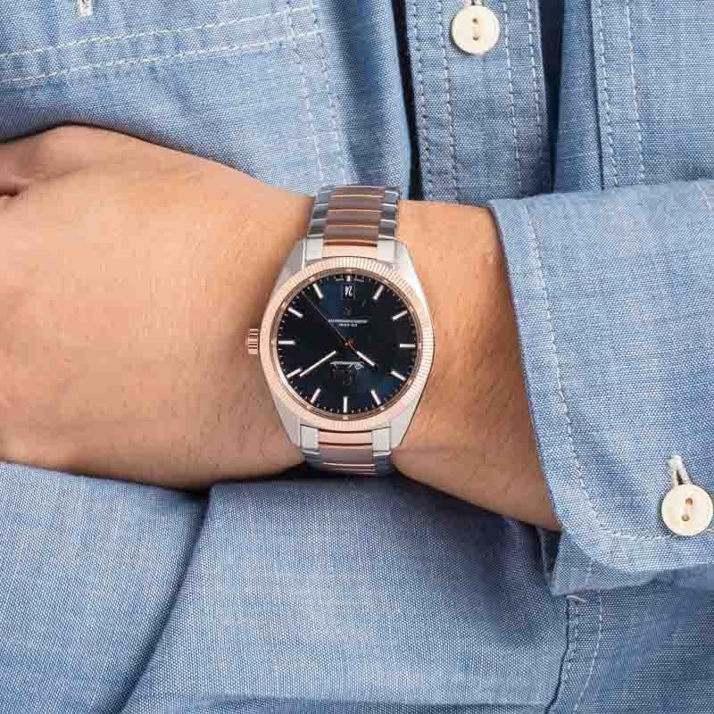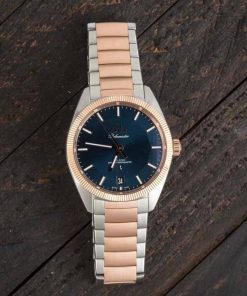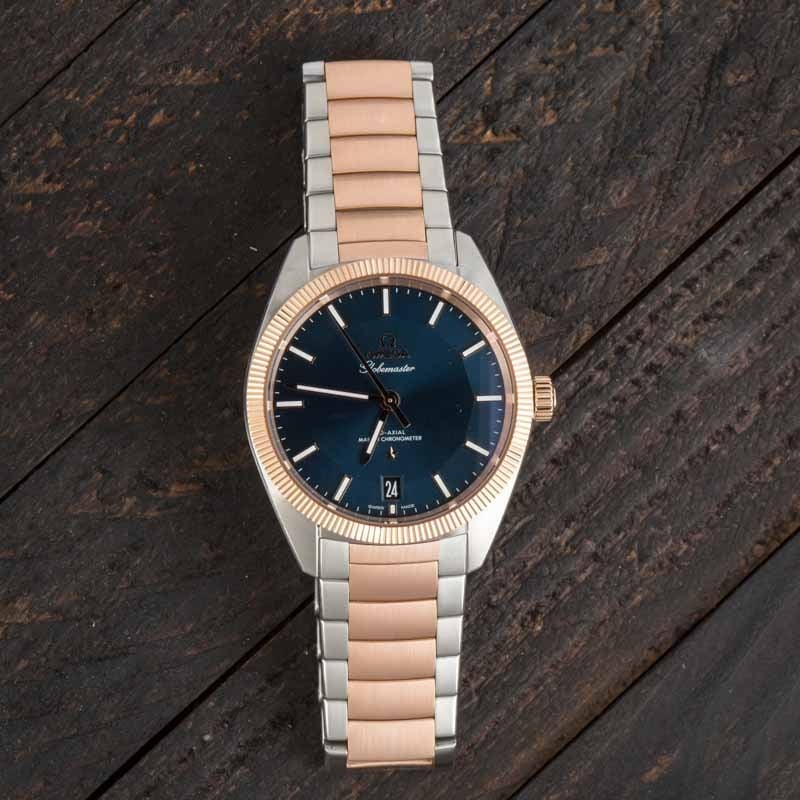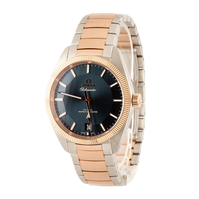 Omega Constellation Globemaster Ref 130.20.39.21.03.001 (2022). A modern icon rooted in heritage, this 39mm Globemaster elevates Omega’s legacy as the world’s first Master Chronometer. The stainless steel case is accented by a fluted bezel in 18K Sedna gold, echoing the warmth of the matching hands, hour markers, and the Constellation star on the dial. A sun-brushed blue “Pie Pan” dial nods to the original 1952 Constellation, blending vintage charm with contemporary precision. The integrated 3-row bracelet features curved Sedna gold center links for a seamless, luxurious finish. Inside, the Co-Axial Master Chronometer Calibre 8900 delivers cutting-edge anti-magnetic performance and exceptional accuracy.