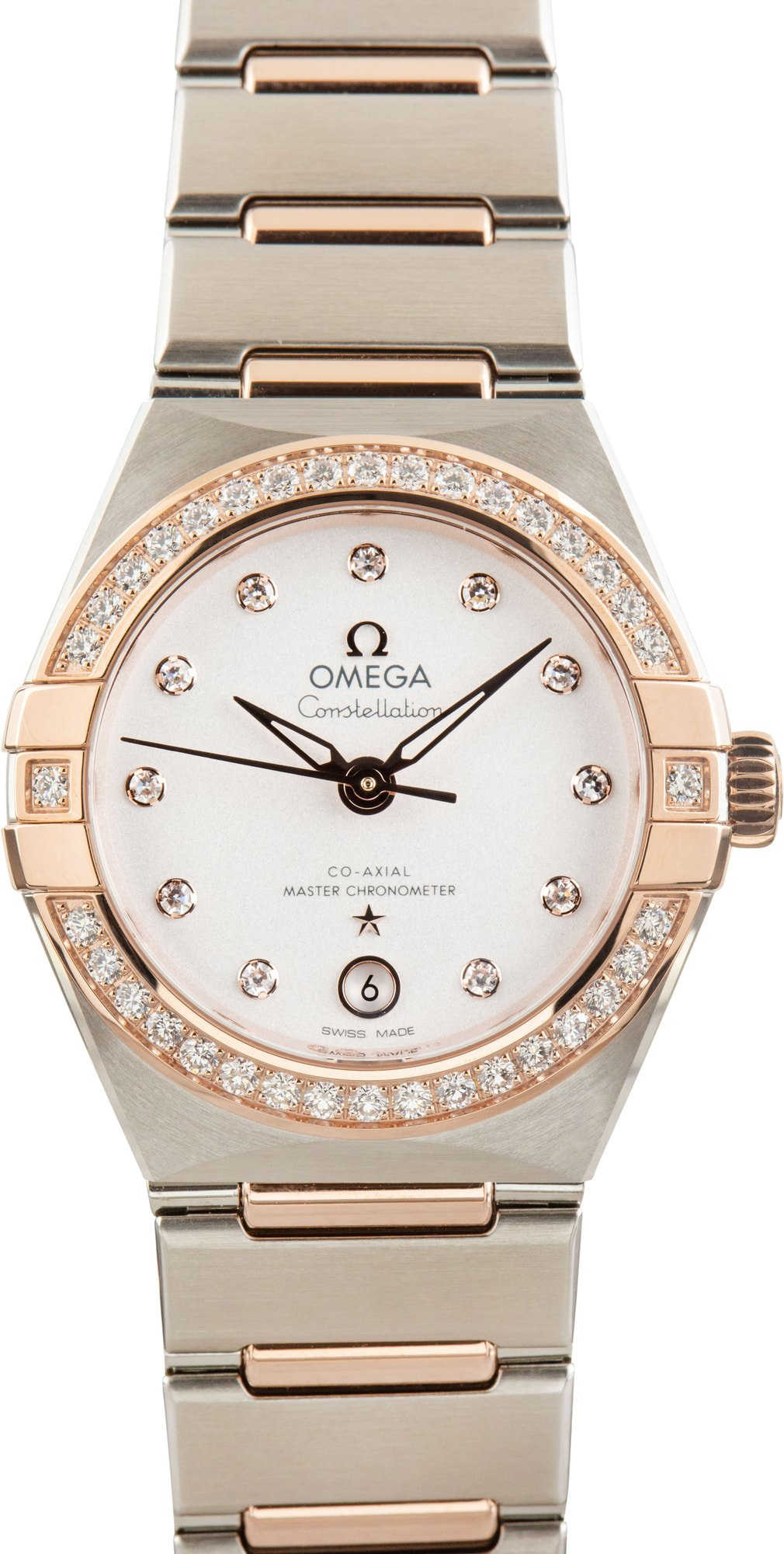 Omega Constellation ref. 131.25.29.20.52.001 (2025) features a 29mm 18K Sedna gold and stainless steel case with a diamond-paved bezel, crystal white silvery dial with diamond hour markers, and a date window at 6 o’clock. The hands, Omega logo, Constellation star, and diamond holders are in 18K Sedna gold, all presented on the signature mono-rang bracelet with half-moons and claws. Powered by the Co-Axial Master Chronometer Calibre 8700, visible through the domed sapphire caseback, it combines luxurious design with modern precision and durability.