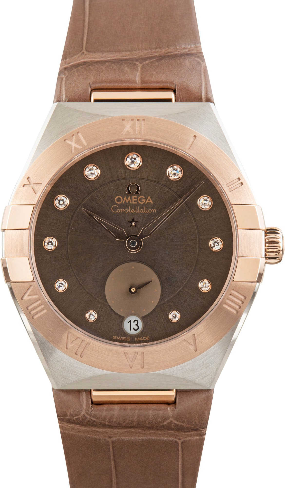Elegant and richly detailed, this /unworn Omega Constellation ref. 131.23.34.20.63.001 is a refined expression of the collection’s iconic design language. The 34mm case combines stainless steel and 18K Sedna gold, highlighted by the signature claws and half-moon facets, along with a Roman numeral–engraved bezel. A light chestnut dial adds warmth and depth, featuring a Small Seconds subdial, central minute track, and diamond hour markers set in 18K Sedna gold holders. Powered by the Co-Axial Master Chronometer Calibre 8802 and finished with a domed sapphire crystal caseback, this watch offers precision performance wrapped in luxurious sophistication—all tied together with a taupe-brown leather strap.