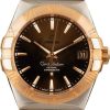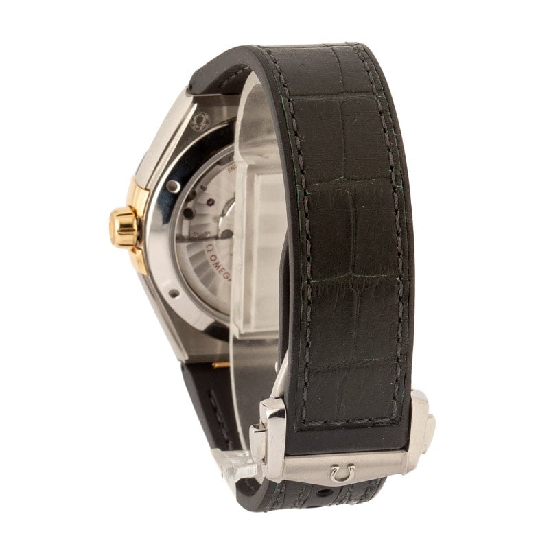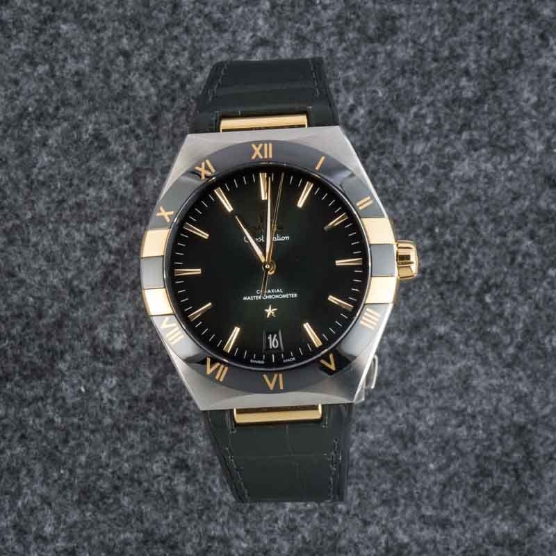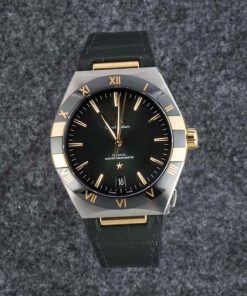 This Omega Constellation ref. 131.23.41.21.10.001 (2024) exudes refined luxury with its striking mix of stainless steel and 18K yellow gold. The rich green sun-brushed dial and black ceramic bezel with Ceragold Roman numerals create a modern, sophisticated aesthetic. Powered by the Master Chronometer Calibre 8900 and fitted with a green leather strap, this 41mm Constellation blends precision, elegance, and contemporary style in perfect harmony.