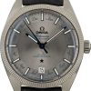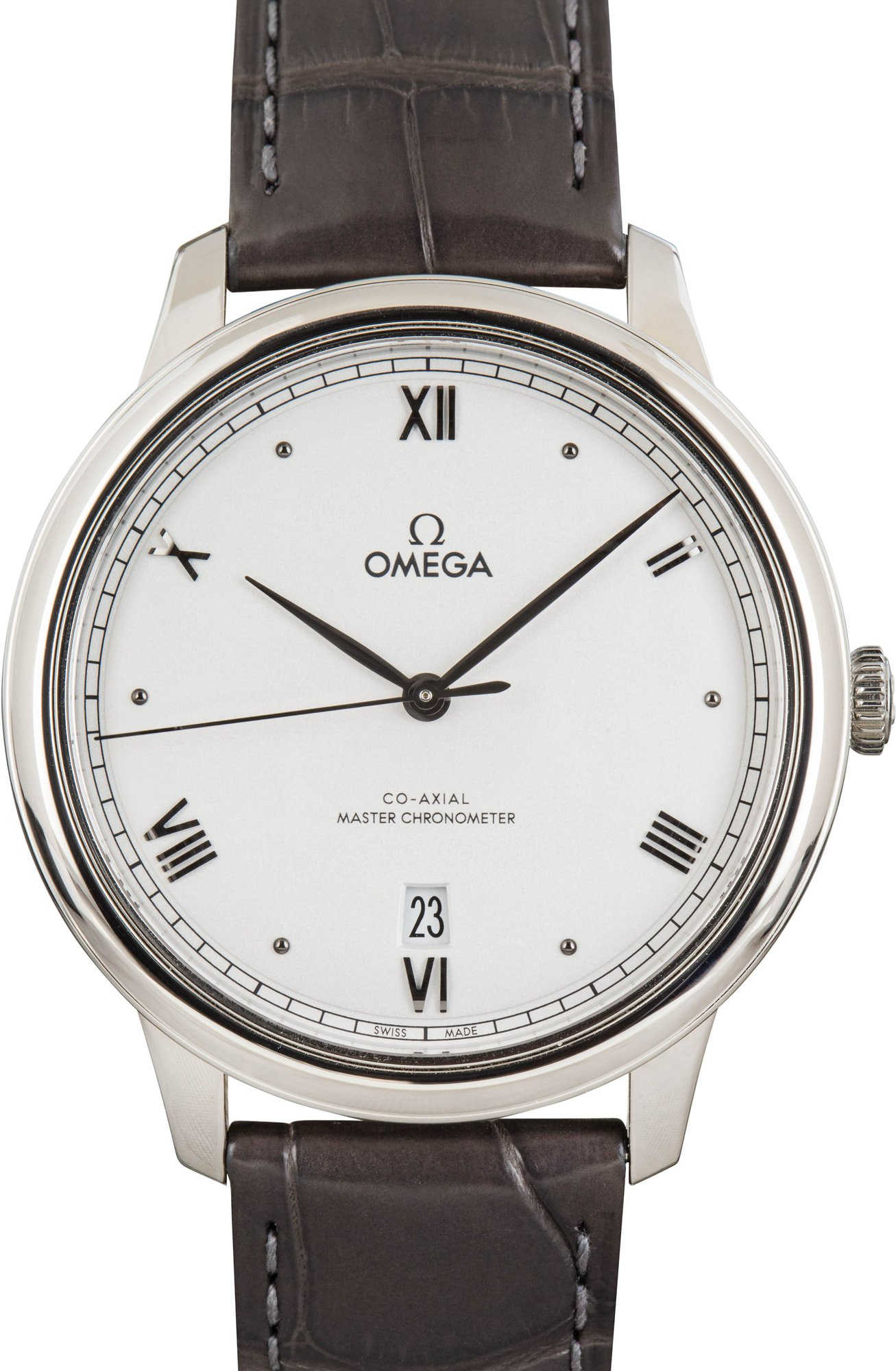 Omega De Ville Prestige ref 434.13.40.20.02.001 (2025) showcases timeless elegance with its 40mm stainless steel case and domed silvery dial featuring a crystal finish, PVD greyed hands, alternating Roman numerals and cabochon indexes, and a date window at 6 o’clock framed by a railway minute track. Presented on a grey leather strap, this Master Chronometer is powered by the Co-Axial Calibre 8800, visible through the sapphire crystal caseback.