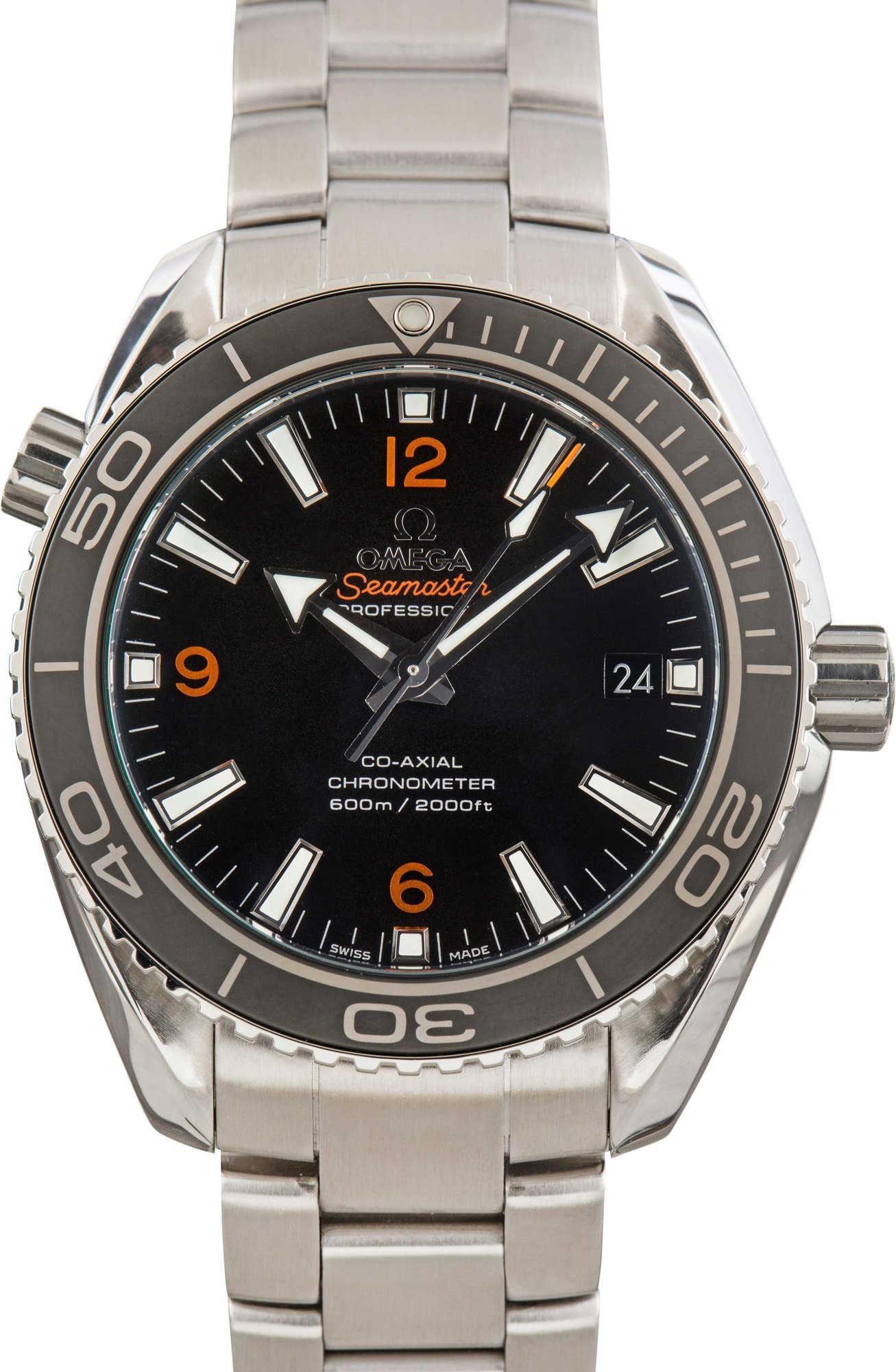 Omega Seamaster Planet Ocean 600M ref. 232.30.42.21.01.003 (2015) features a 42mm stainless steel case with a black ceramic unidirectional dive bezel, black dial with date at 3 o’clock, and a stainless steel bracelet. Powered by the Co-Axial Calibre 8500, visible through the sapphire caseback, this certified chronometer offers water resistance to 600 meters, a helium escape valve, and scratch-resistant sapphire crystal, combining Omega’s dive watch heritage with professional-grade functionality.