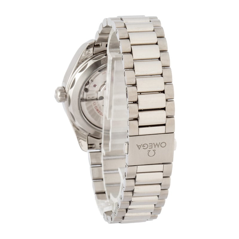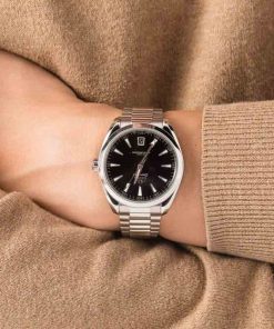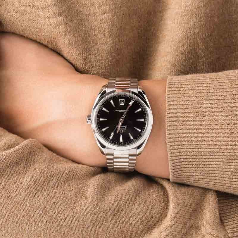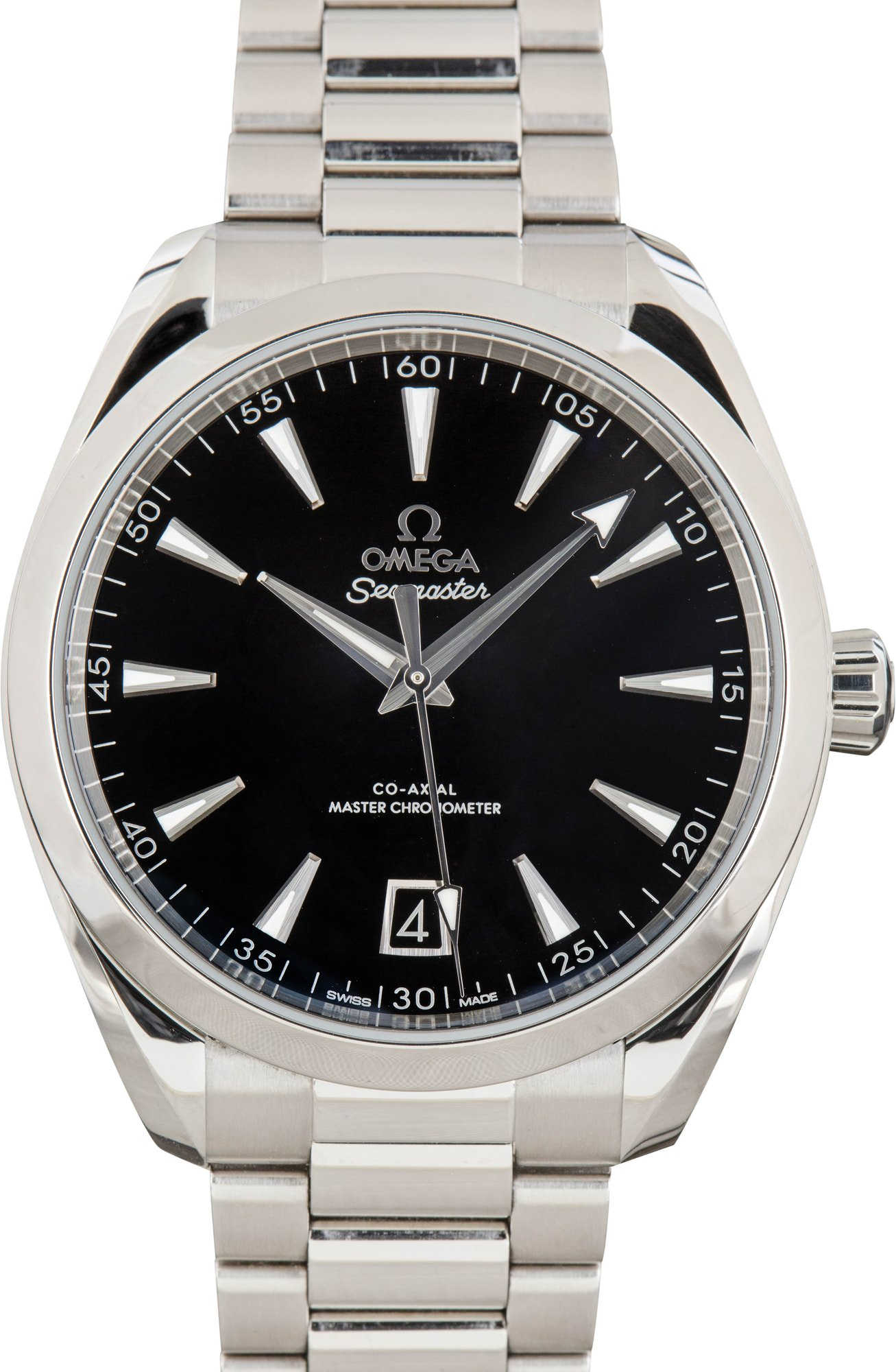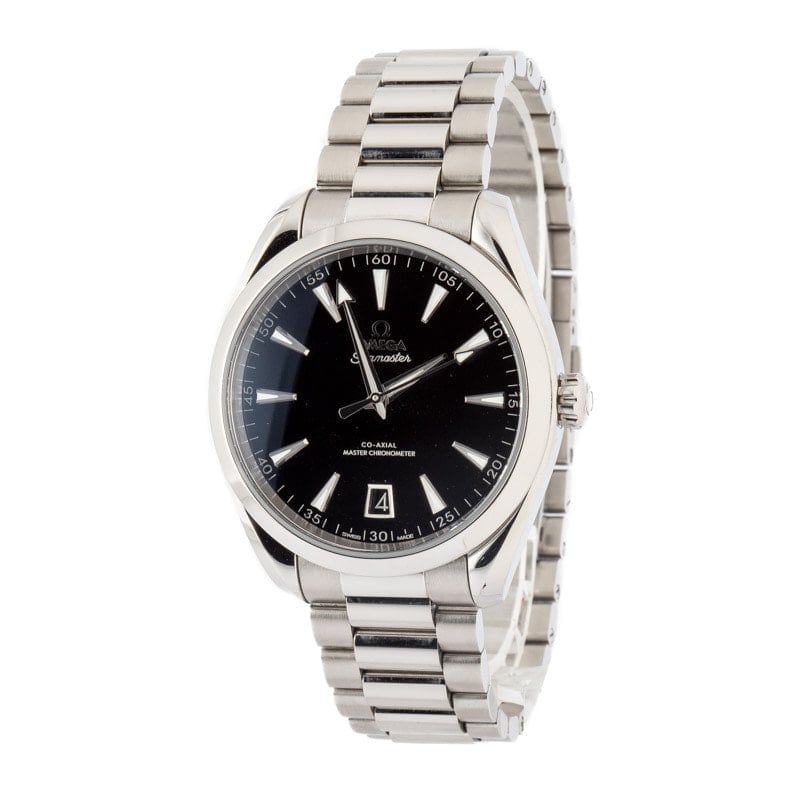 Omega Seamaster Aqua Terra 41mm features a lacquered black dial with rhodium-plated hands, luminous markers, and a date window at 6 o’clock, housed in a wave-edged stainless steel case with a balanced, symmetrical profile. Powered by the METAS-certified Co-Axial Master Chronometer Calibre 8900 and presented on an integrated bracelet, it combines precision, durability, and contemporary maritime-inspired design for a versatile, everyday luxury timepiece.