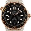 This Omega Seamaster Diver 300M ref. 210.92.42.20.01.003 (2025) features a 42mm Bronze Gold case paired with a red ceramic unidirectional bezel and black rubber strap. The black luminous dial showcases wave detailing, bold indexes, and a clean, no-date layout. Driven by the Co-Axial Master Chronometer Caliber 8806, this piece blends distinctive materials with professional-grade dive capability and modern Omega innovation.