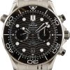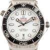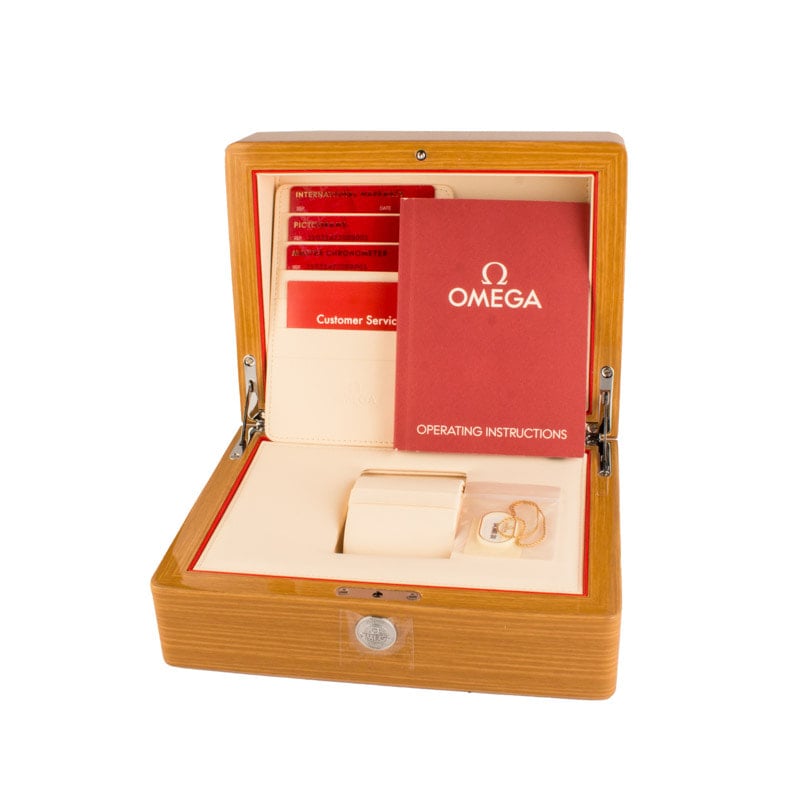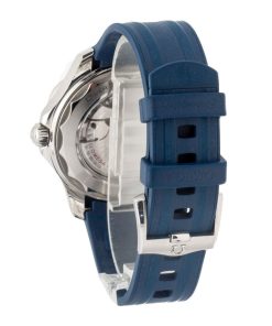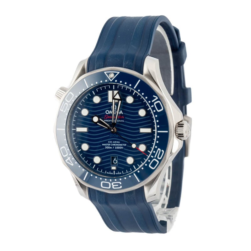 This 42 mm Seamaster Diver 300M is crafted from stainless steel and features a polished blue ceramic dial with laser-engraved waves, complemented by a matching blue ceramic bezel with a white enamel diving scale. Skeleton hands and raised rhodium-plated indexes filled with Super-LumiNova ensure excellent legibility, while the conical helium escape valve highlights its professional-grade diving capability. Powered by the OMEGA Master Chronometer Calibre 8800 and presented on a sporty blue rubber strap, this timepiece combines precision, durability, and iconic Seamaster style, with the movement visible through the sapphire-crystal wave-edged caseback.