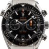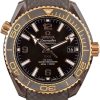 This Omega Seamaster Planet Ocean “Deep Black” ref. 215.92.46.22.01.002 from 2020 is a bold fusion of cutting-edge technology and deep-sea exploration. Crafted from a single block of black ceramic, this 45.5mm timepiece is both striking and durable, with blue accents symbolizing the last visible color at extreme ocean depths. The innovative ceramic and rubber bezel, Liquidmetal diving scale, and GMT functionality make this a true tool watch, while 18K white gold hands and indexes ensure refined sophistication. Powered by the Master Chronometer calibre 8906 and water-resistant to 600m, this Seamaster is built for those who dare to explore.