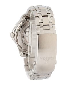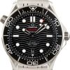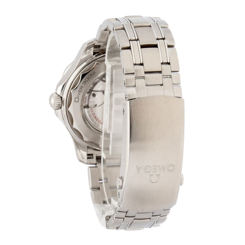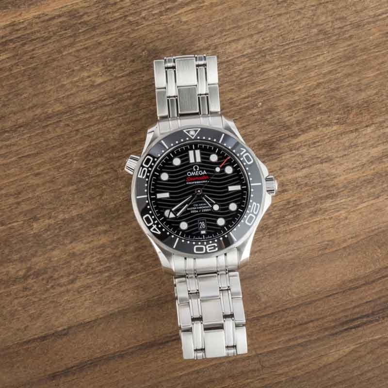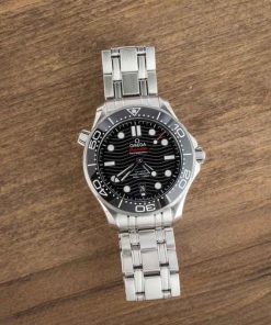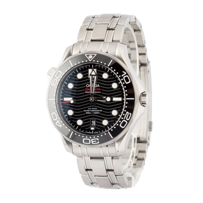 This 42 mm Seamaster Diver 300M is crafted from stainless steel and features a polished black ceramic dial with laser-engraved waves, paired with a matching black ceramic bezel and white enamel diving scale. Rhodium-plated skeleton hands and raised indexes filled with Super-LumiNova ensure sharp, legible contrast, while the conical helium escape valve underscores its professional dive capability. Presented on a stainless steel bracelet and powered by the OMEGA Master Chronometer Calibre 8800—visible through the sapphire-crystal wave-edged caseback—this model delivers precision, durability, and the iconic look that defines the modern Seamaster.