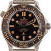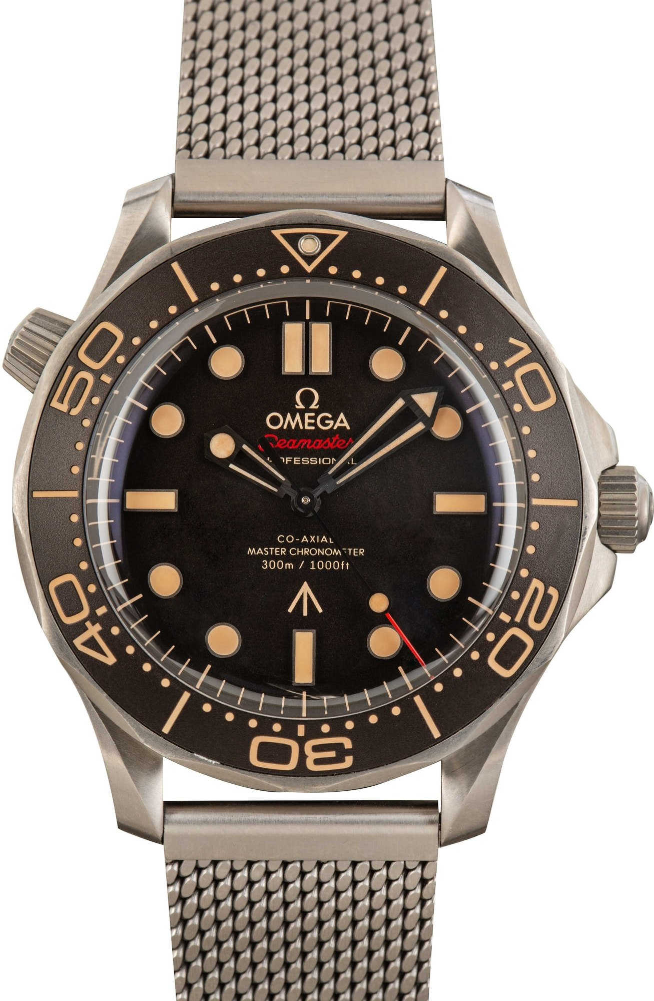 Omega Seamaster Diver 300M ref. 210.90.42.20.01.001 (2020–2025), identical to James Bond’s watch in No Time To Die, features a 42mm Grade 2 titanium case with a brown “tropical” aluminum bezel and dial. Slightly slimmer than standard Diver 300M models thanks to its domed sapphire crystal, it is finished on a Grade 2 titanium mesh bracelet with an adjustable buckle. Powered by the Co-Axial Master Chronometer Calibre 8806, it delivers top-tier precision, chronometric performance, and magnetic resistance in a lightweight, professional-grade dive watch.
