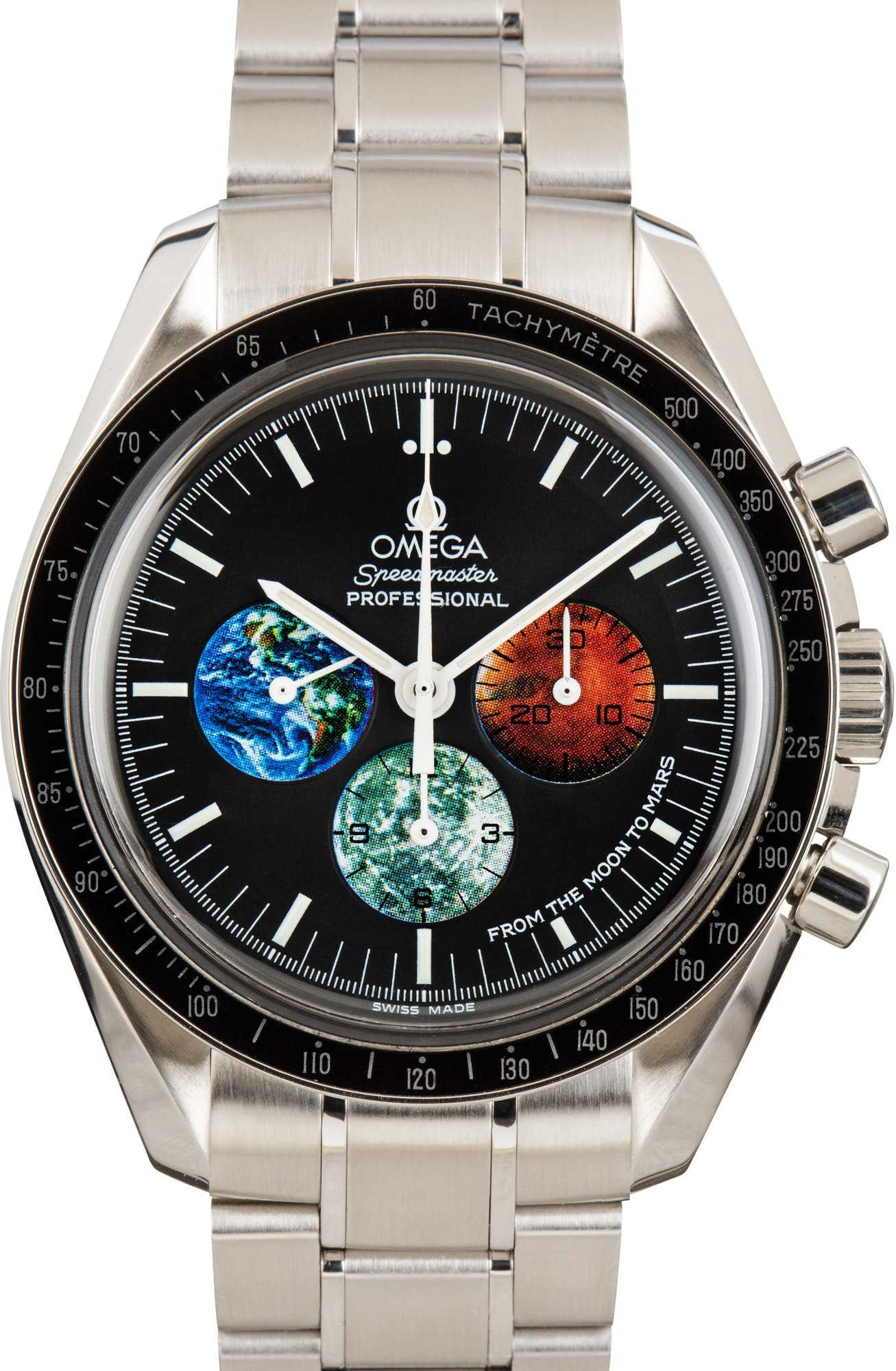 This Omega Speedmaster “From the Moon to Mars” ref 3577.50.00 captures the spirit of space exploration in a way few watches ever have. Housed in a 42mm stainless steel case with a classic black tachymeter bezel, this special edition stands out with a black dial featuring three colorful subdials — Earth, Mars, and the Moon — each detailed with vivid, artistic flair. It’s powered by Omega’s legendary hand-wound Caliber 1861, the same movement lineage that once rode to the lunar surface. Built tough and steeped in cosmic history, this is a Speedmaster that dares to dream beyond the Moon.