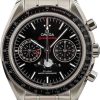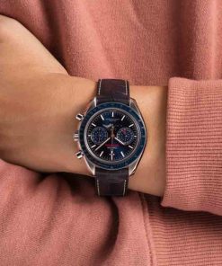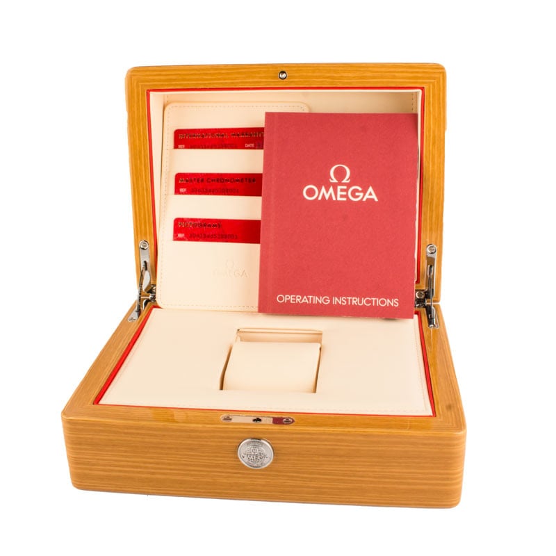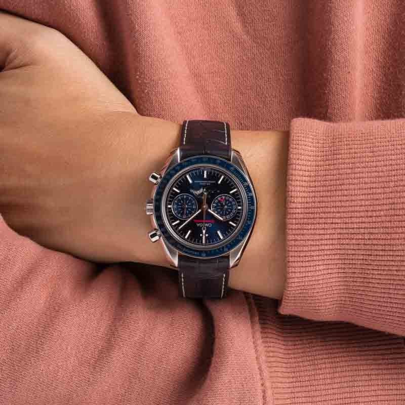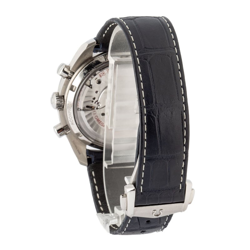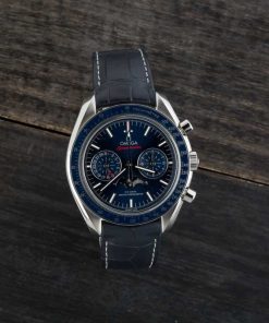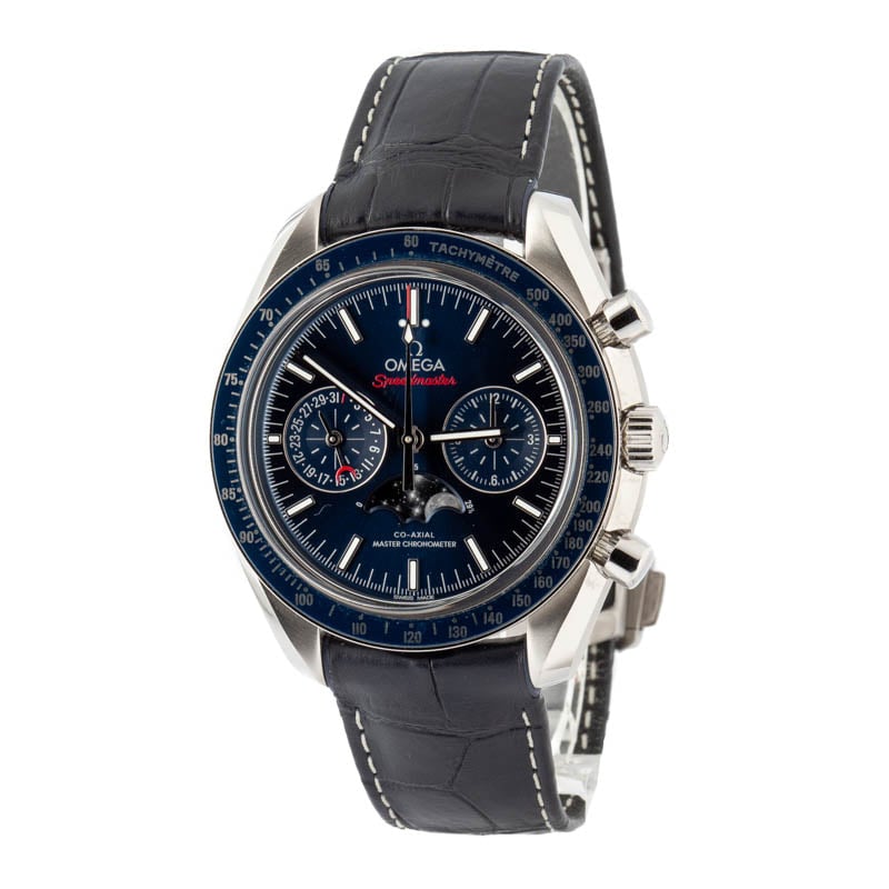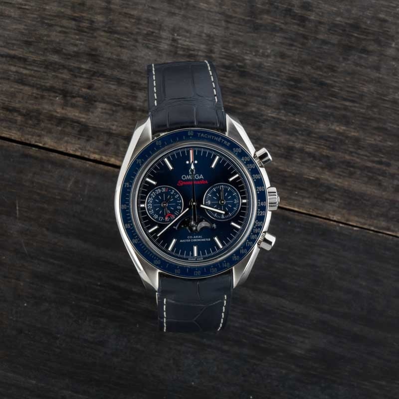 Omega Speedmaster Moonphase ref. 304.33.44.52.03.001 (2021). This 44.25mm gents’ watch features a stainless steel case with a striking blue dial and scratch-resistant sapphire crystal with anti-reflective treatment on both sides. Powered by the Omega 9904 self-winding movement, it offers a 60-hour power reserve and 10 bar (100 meters / 330 feet) water resistance.