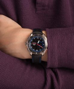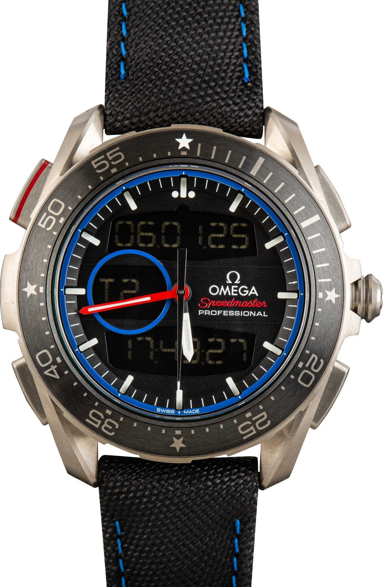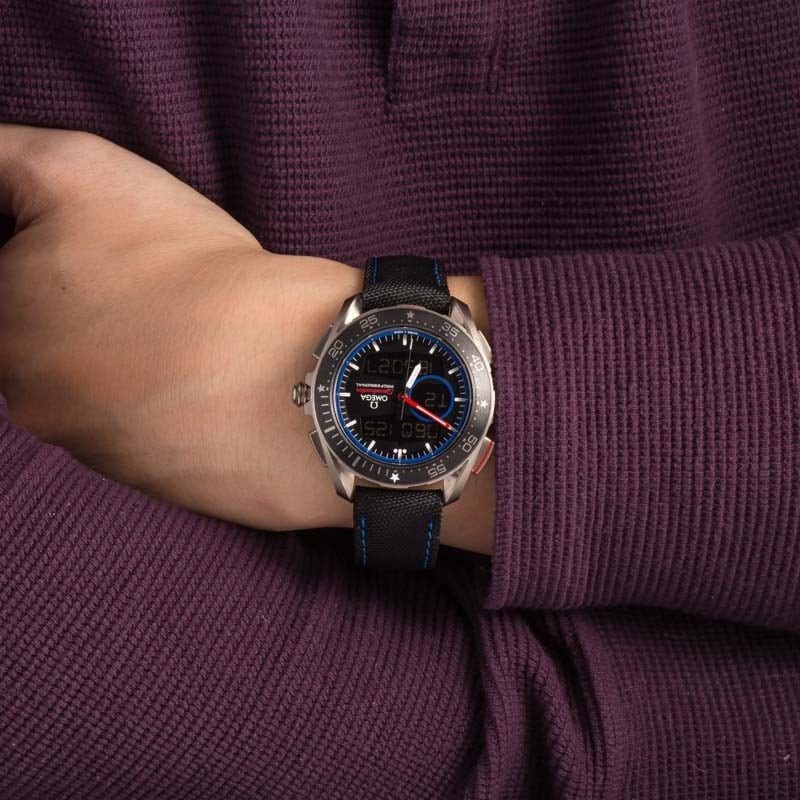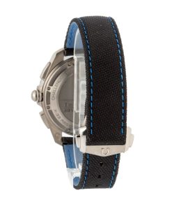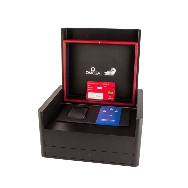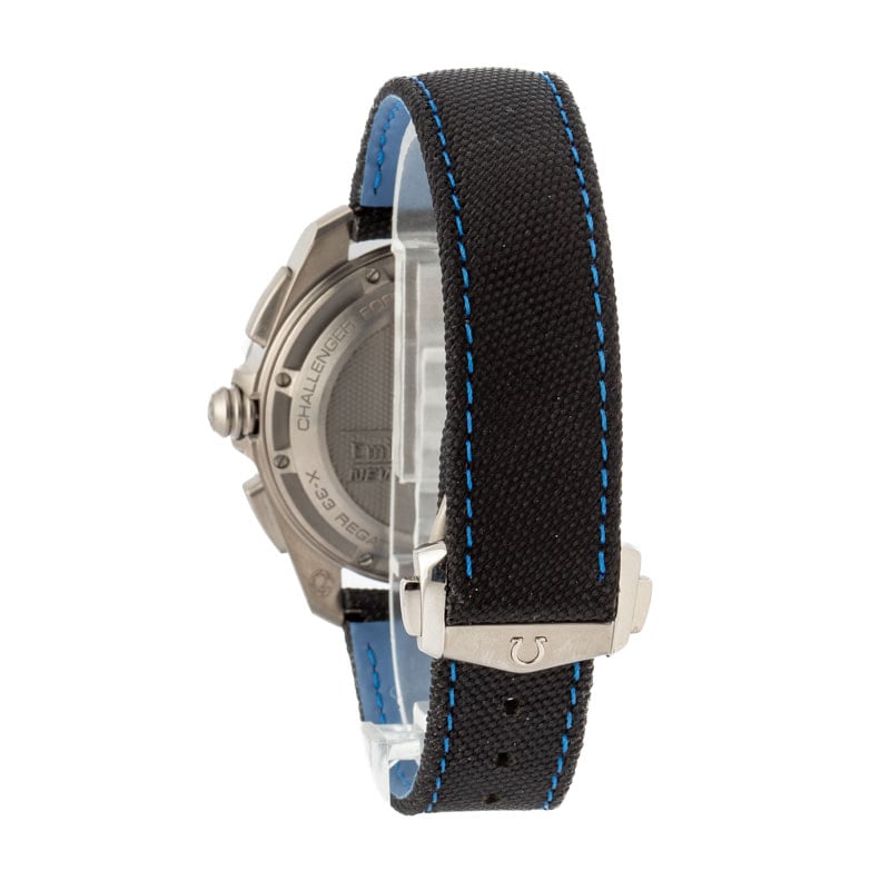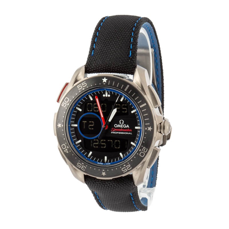 This OMEGA Speedmaster Dark X-33 Regatta ref. 318.92.45.79.01.001 (2020) ‘ETNZ Limited Edition’ celebrates OMEGA’s partnership with Emirates Team New Zealand. Crafted with a 45mm lightweight titanium case and a timing bezel, this watch is engineered for high performance. The black index dial features blue rings and cutouts for digital readings, combining analog precision with digital versatility. A coated nylon fabric strap enhances its durability and comfort. Powered by the quartz OMEGA Caliber 5620, this timepiece is purpose-built for regatta timing and embodies the spirit of competitive sailing.