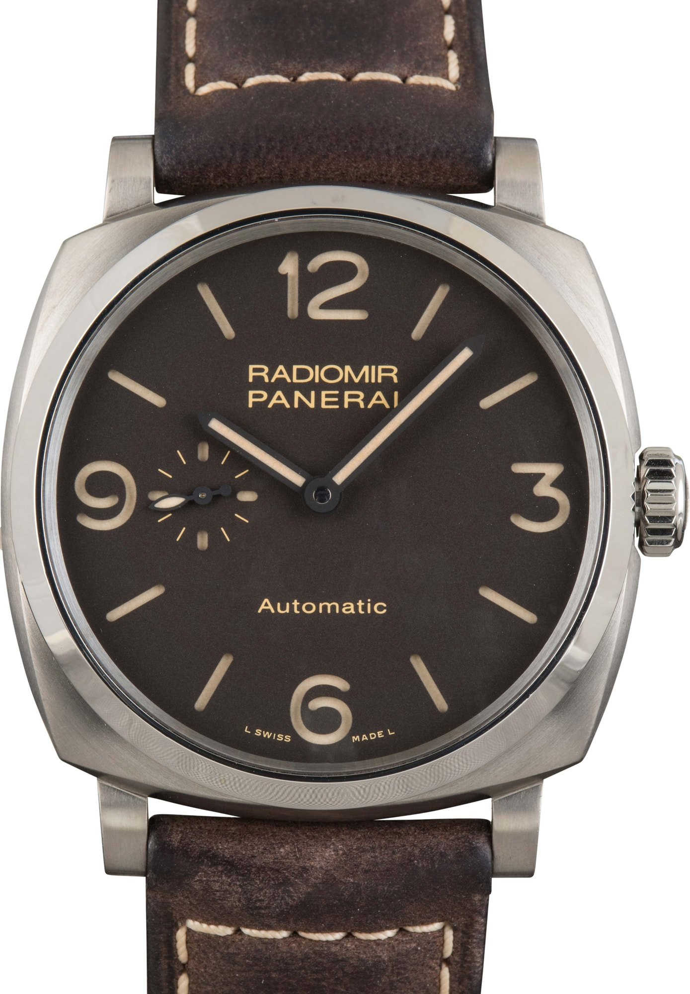 This Panerai Radiomir ref. PAM00619 (2015) commands attention with its 45mm brushed titanium case, polished titanium bezel, and see-through sapphire caseback. The brown dial features bold luminous Arabic numerals, hour markers, and a small seconds at 9 o’clock for rugged legibility. Powered by the automatic P.4000 calibre with a 3-day power reserve and dual barrels, this lightweight, durable timepiece delivers precision and toughness, all wrapped in Panerai’s iconic Radiomir design.