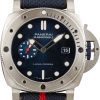 Panerai Submersible QuarantaQuattro Grigio Roccia ref. PAM01288 (2022) features a 44mm brushed eSteel™ case paired with a polished ceramic unidirectional bezel. Its anthracite gradient dial displays luminous hour markers and dots, with a date window at 3 o’clock and small seconds at 9 o’clock. Powered by the automatic P.900 calibre with a 3-day power reserve, 23 jewels, and 171 components, this Submersible delivers precision and reliability. Water resistant to 300 meters, it combines Panerai’s professional dive watch capability with striking contemporary design.