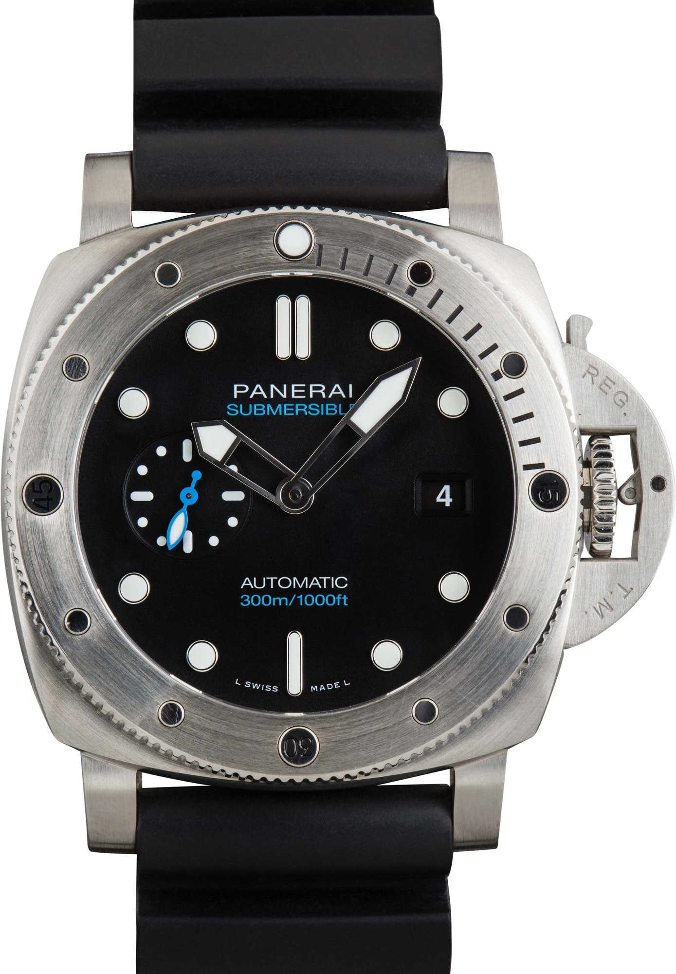 Built for the depths but styled for the surface, this Panerai Submersible QuarantaQuattro Ref. PAM01229 (2022) features a bold 44mm stainless steel case paired with a rugged black rubber strap. The black dial is equipped with a small seconds sub-dial at 9 o’clock and a date window at 3, framed by a unidirectional rotating bezel built for serious dive timing. With signature Panerai presence and underwater capability, this is a modern diver with unmistakable edge.