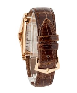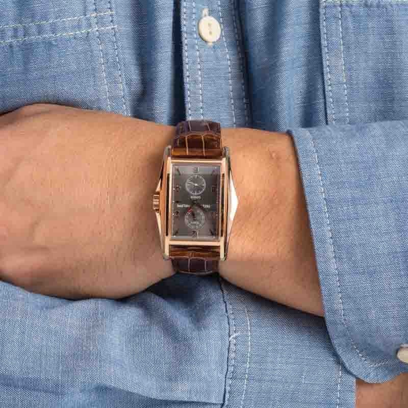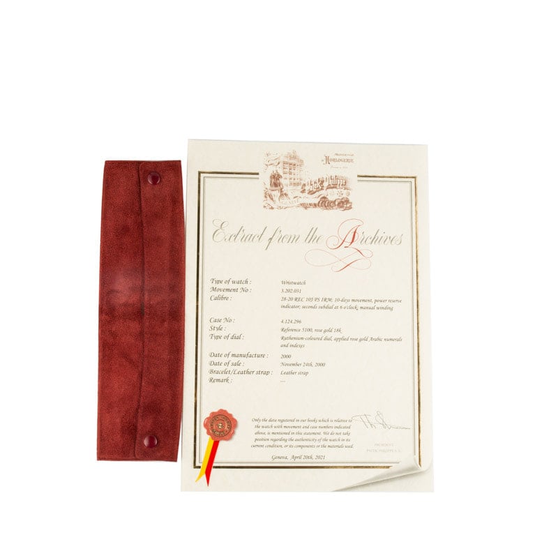 Created to mark the new millennium, this Patek Philippe Gondolo ref. 5100R-001 is a limited edition masterpiece in 18k rose gold, showcasing bold Art Deco-inspired design and exceptional mechanical engineering. The elongated 34mm x 46mm case frames a rich grey dial with applied gold markers and dauphine hands, while the manual-wind Caliber 28-20 REC 10J PS IRM delivers an impressive 10-day power reserve, visible through the sapphire caseback. Offered with a Patek Philippe service pouch and Extract from the Archives paperwork, this elegant timepiece is a refined and collectible expression of Patek’s heritage.
