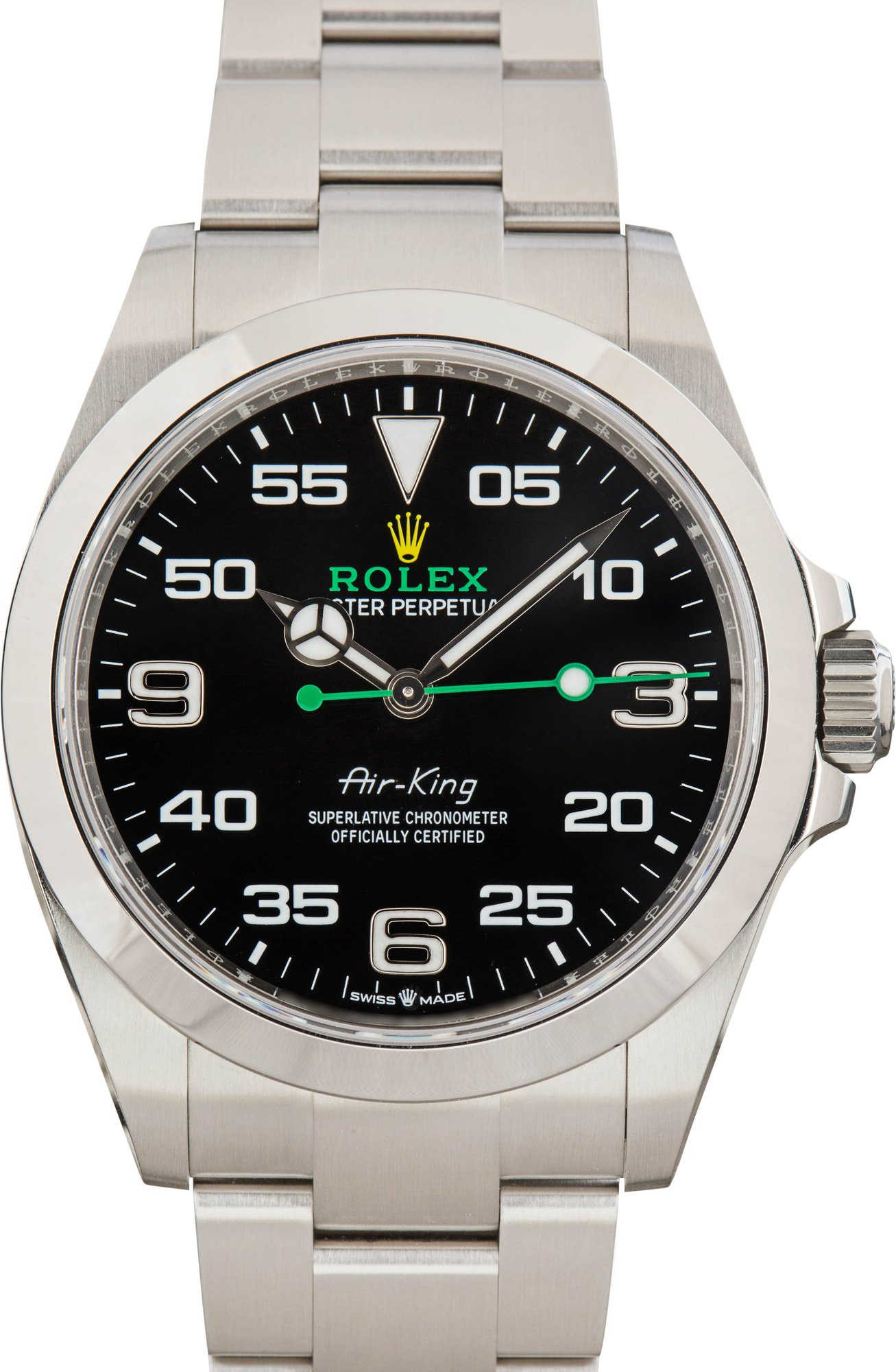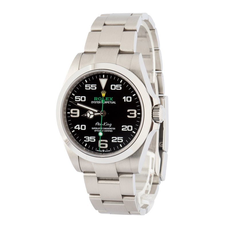 This Air-King fuses bold styling with modern innovation, featuring a 40mm Oystersteel case, black dial with luminous 3‑6‑9 numerals, and the signature green and yellow Rolex logo. Powered by Caliber 3230 with a 70-hour power reserve, it introduces crown guards and a refined Oyster bracelet with Easylink extension for all-day comfort. A contemporary evolution of an aviation classic, this Air-King delivers precision, durability, and unmistakable Rolex character.