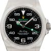 This Rolex Air-King ref. 116900 (2017) combines aviation heritage with modern Rolex engineering. Its 40mm Oystersteel case is paired with a smooth bezel and a bold black dial featuring Arabic numerals, the iconic green seconds hand, and yellow Rolex crown. Powered by the anti-magnetic Calibre 3131 automatic movement with a 48-hour power reserve, this chronometer offers both precision and durability. Completed with an Oyster bracelet and Easylink clasp system, this Air-King is water resistant to 100 meters and delivers a distinctive, sporty look that sets it apart in the Rolex lineup.