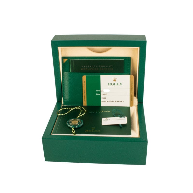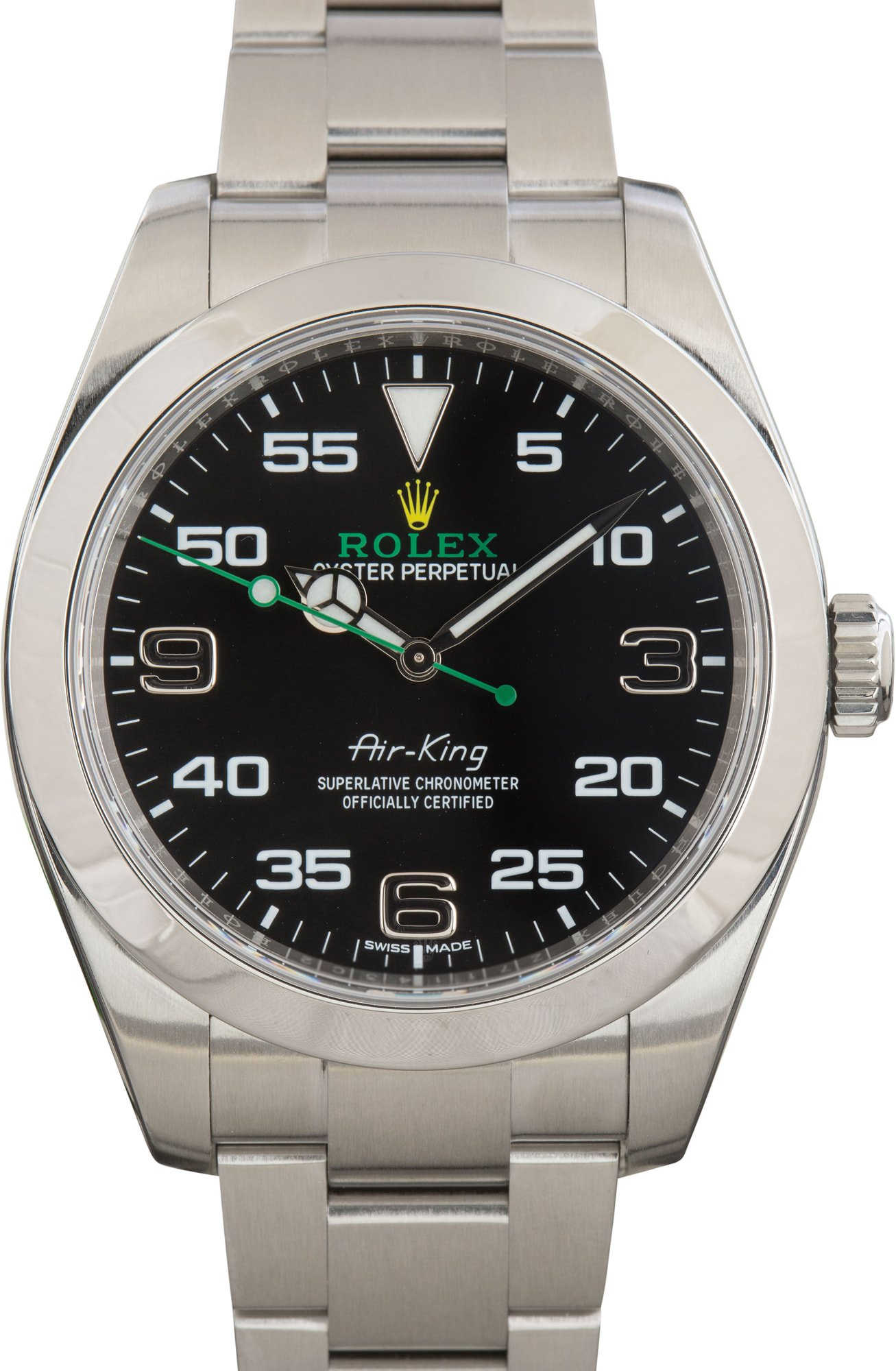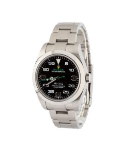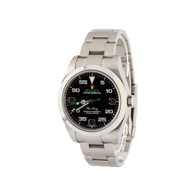 Bold and distinctive, this 2018 Rolex Air-King 116900 blends aviation heritage with modern Rolex engineering. Its 40mm Oystersteel case provides a robust yet versatile wrist presence, paired with a striking black dial accented by prominent white Arabic numerals and green seconds hand for a unique touch of character. Powered by Rolex’s Caliber 3131 automatic movement, it delivers precision, reliability, and a 48-hour power reserve. Finished with a classic Oyster bracelet, this Air-King is a fearless statement of style, built for those who chart their own course.