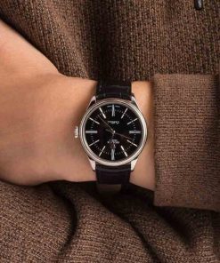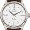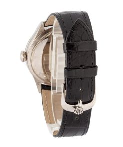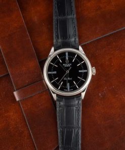 This Rolex Cellini ref 50509 (2014 – 2022) presents refined elegance in a 39mm 18k white gold case with a signature double-stepped fluted bezel. The black index dial is sleek and minimal, paired with a matching black Rolex leather strap for classic formal appeal. Powered by the Rolex caliber 3165, this Cellini delivers understated sophistication with precision timekeeping.