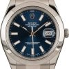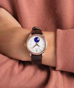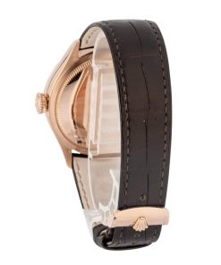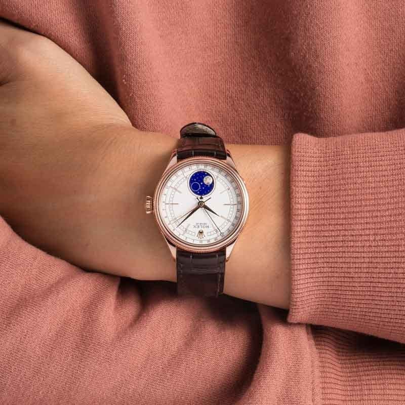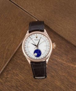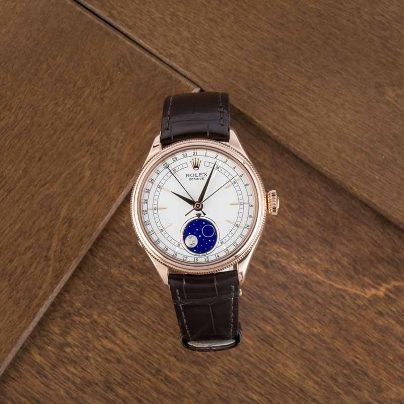 This Rolex Cellini ref 50535 (2020) features an 18k Everose gold case and a white index dial with a blue enameled moonphase disc. Its design is highlighted by a domed inner bezel and a fluted outer bezel. Completed with a Rolex leather strap and buckle and powered by the 3195 movement, it exudes timeless elegance.