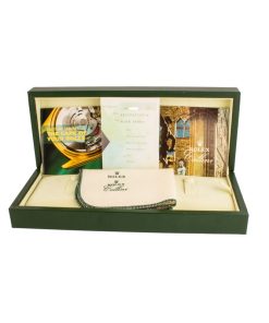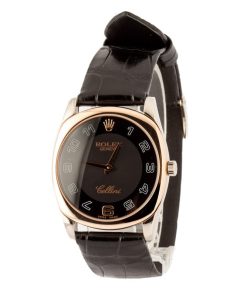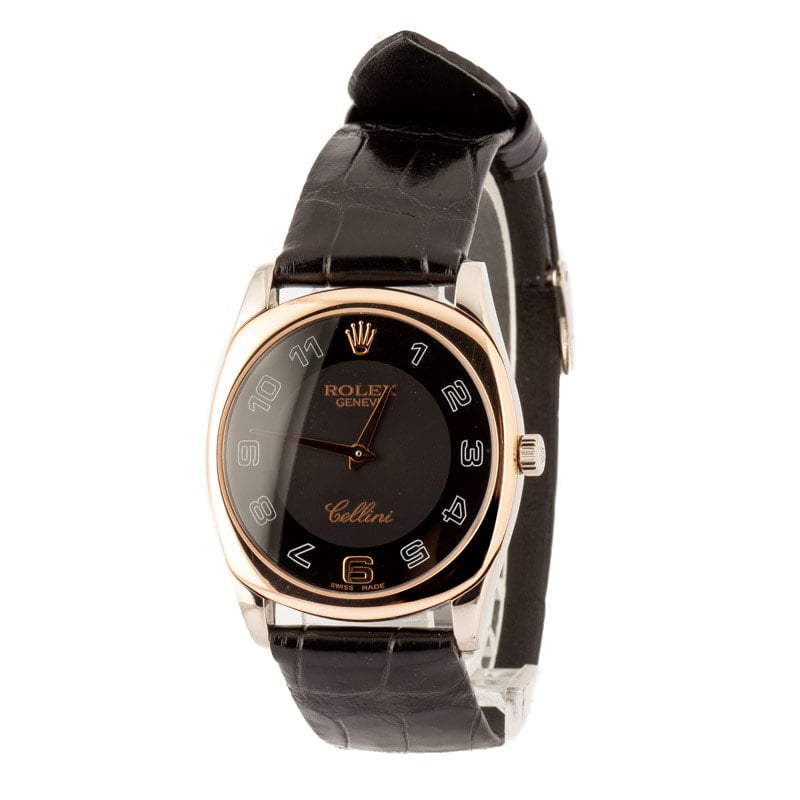 This Rolex Cellini ref 4233 (2006) is a 33mm dress piece in 18k white gold with a contrasting 18k everose gold smooth bezel, showcasing Rolex’s refined dual-tone craftsmanship. It features a striking black Arabic dial and comes fitted on a black Rolex leather strap. Powered by the manual-wind Caliber 1602, this Cellini blends elegance with a minimalist, vintage charm.