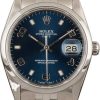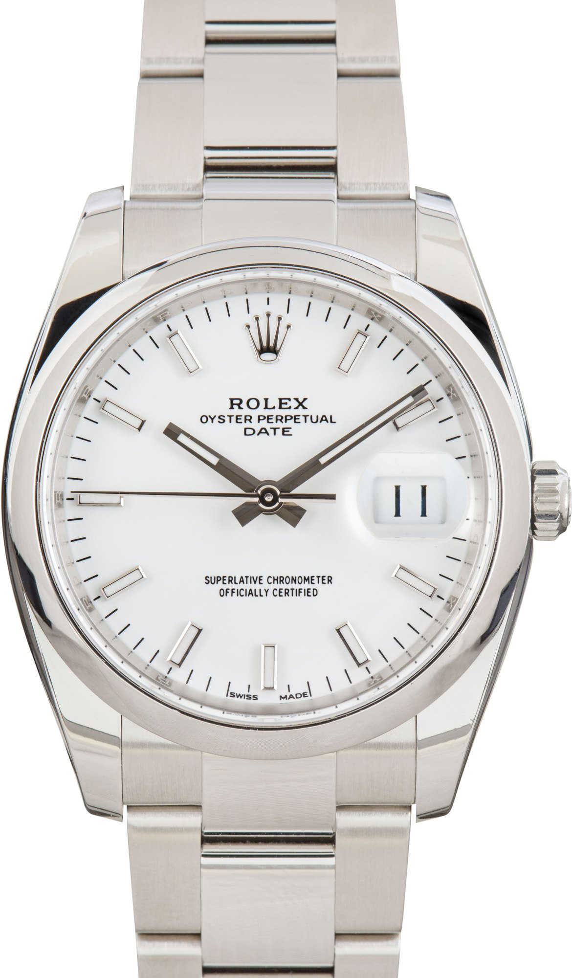This Rolex Date ref 115200 (2021) offers a clean, classic aesthetic in a versatile 34mm stainless steel case. Featuring a smooth polished bezel and a crisp white dial with luminous index hour markers, it delivers understated elegance and easy readability. Powered by the reliable Rolex Calibre 3135 automatic movement, it combines precision with a 48-hour power reserve. Finished with a matching stainless steel Oyster bracelet, this reference is a refined everyday timepiece with timeless Rolex appeal.