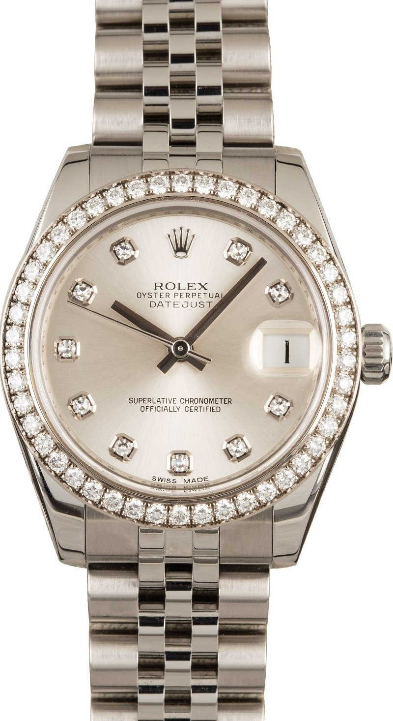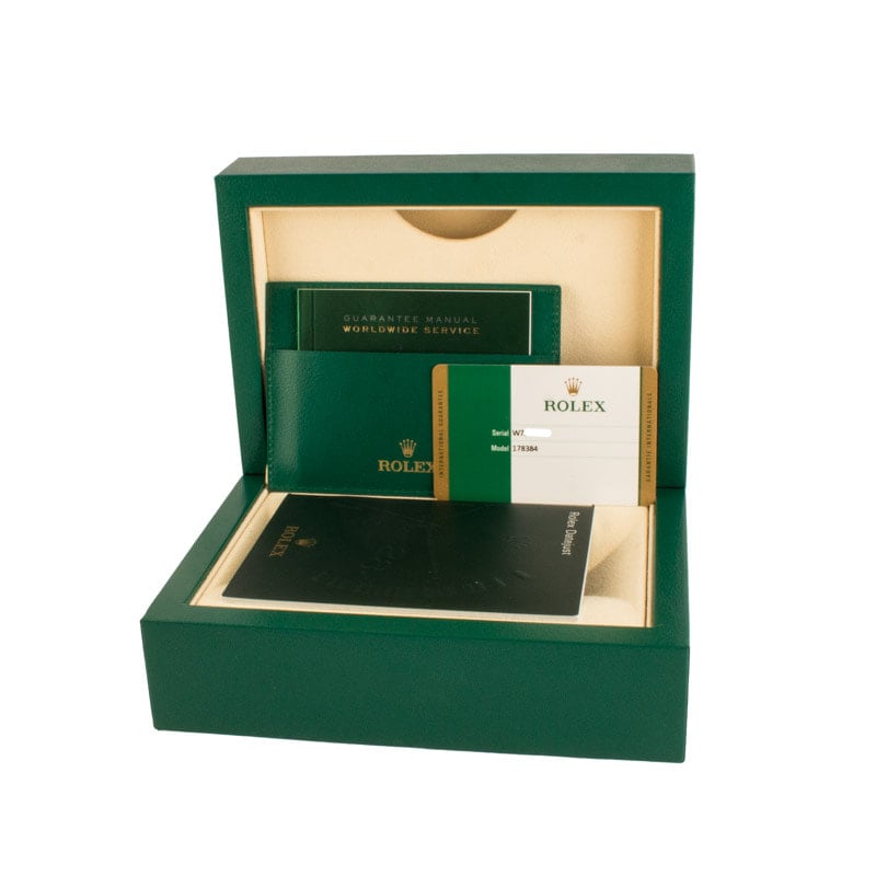 This Rolex Datejust 31 ref. 178384 (2017) features a 31mm stainless steel case with a diamond-set bezel surrounded in 18k white gold. The silver dial is adorned with diamond hour markers, adding an elegant touch to its classic design. Powered by the automatic Caliber 2235 and fitted with a President bracelet, this Datejust blends refined luxury with reliable Rolex performance.