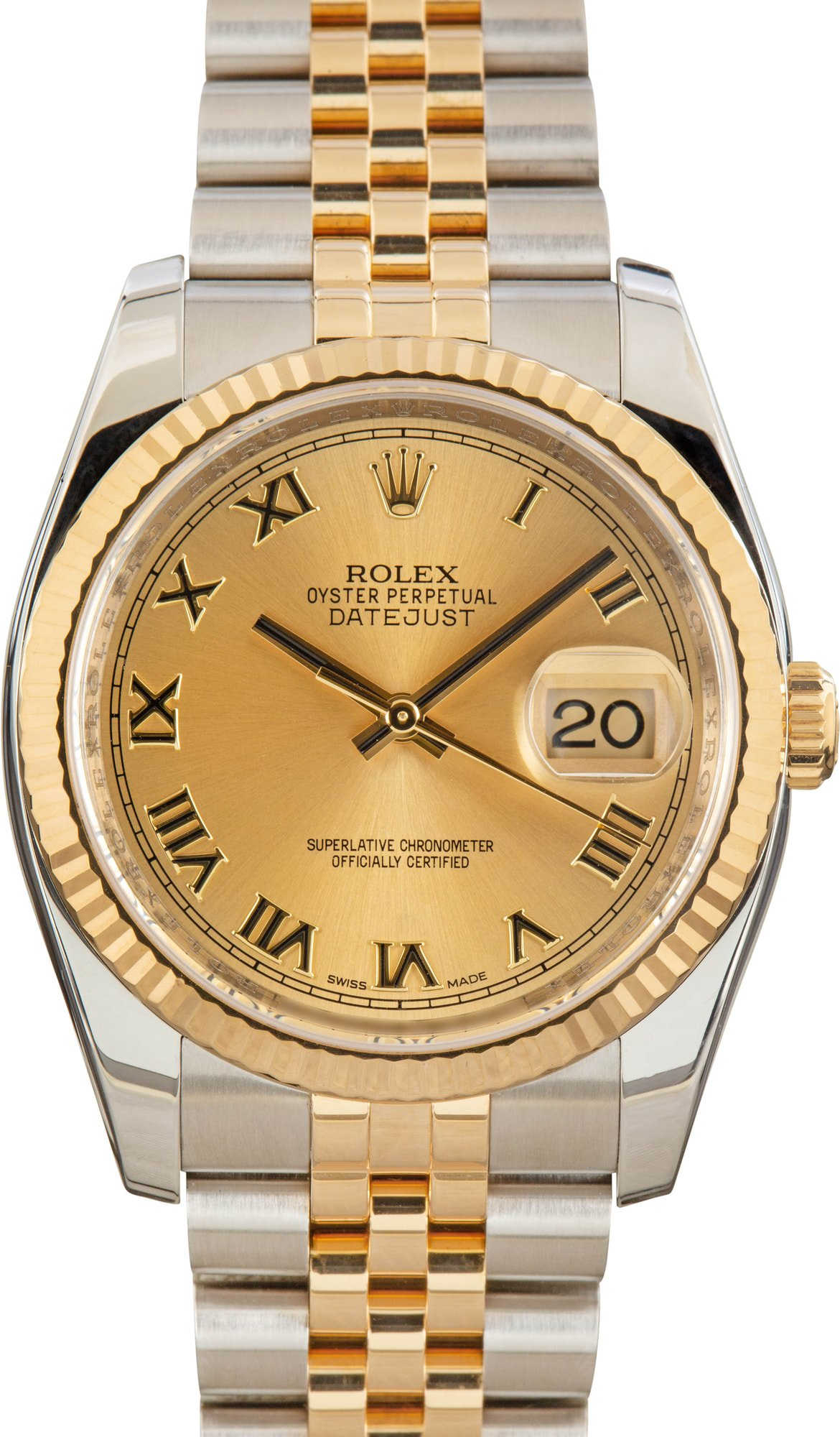 This Rolex Datejust ref. 116233 (2015) features a 36mm stainless steel case with an 18k yellow gold fluted bezel, combining classic design with refined detail. The champagne Roman dial adds warmth and balance, complemented by a two-tone Jubilee bracelet for a timeless appearance. Elegant, versatile, and unmistakably Rolex, this Datejust embodies everyday luxury and enduring style.