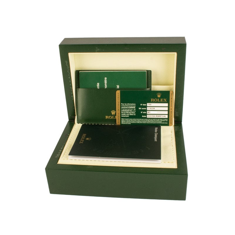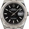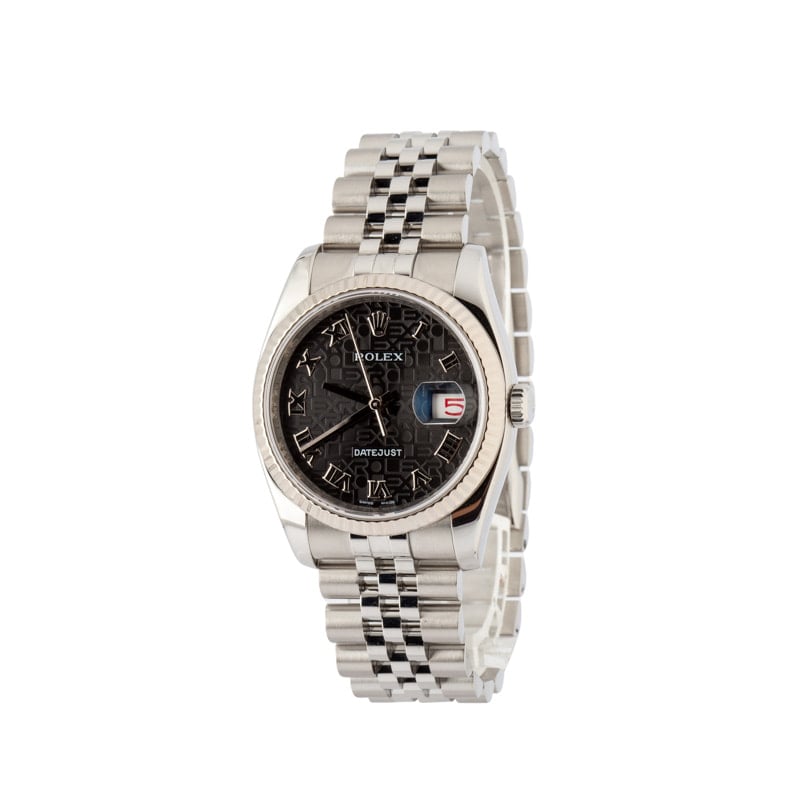 Rolex Datejust 36 ref. 116234 (2007 – 2008) features a 36mm stainless steel case with an 18k white gold fluted bezel and a matching Jubilee bracelet. Its black Jubilee dial with Roman numerals and roulette date display exudes classic sophistication, while Rolex’s automatic movement ensures precise, reliable timekeeping—a timeless choice for everyday elegance.
