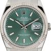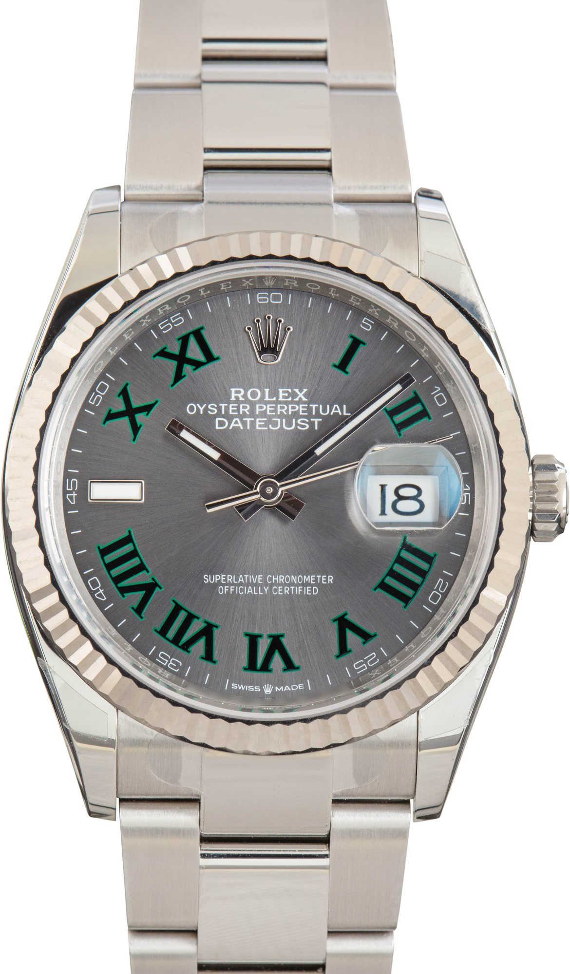 Elevate your style with this Rolex Datejust ref. 126234 (2025). Its 36MM stainless steel case is paired with a sleek Oyster bracelet, while the iconic slate Wimbledon dial with green-outlined Roman numerals delivers a modern twist on timeless elegance. Powered by the Rolex Caliber 3235 automatic movement, this Datejust combines precision, reliability, and understated sophistication—perfect for any occasion.