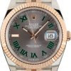 Rolex Datejust 41 ref. 126331 (2018) pairs a 41mm stainless steel case with an 18k Everose gold fluted bezel for a warm, refined look. Its slate “Wimbledon” dial with green-outlined Roman numerals offers a distinctive, modern style. Fitted with a two-tone Oyster bracelet and powered by Caliber 3235 with a 70-hour power reserve, this Datejust balances luxury, precision, and contemporary flair.