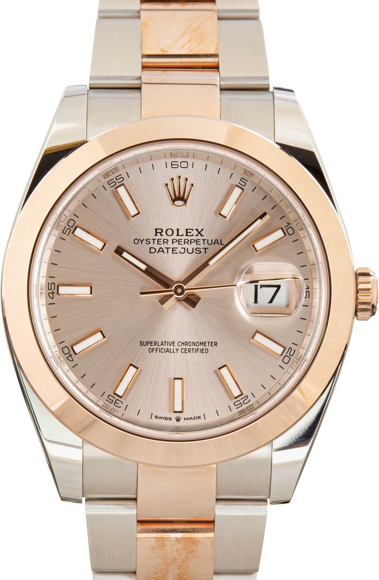 This Rolex Datejust from 2024 stands out with its Sundust index dial, two-tone steel and 18k Everose gold bracelet, and its full set of box and papers—a timeless blend of luxury and craftsmanship.