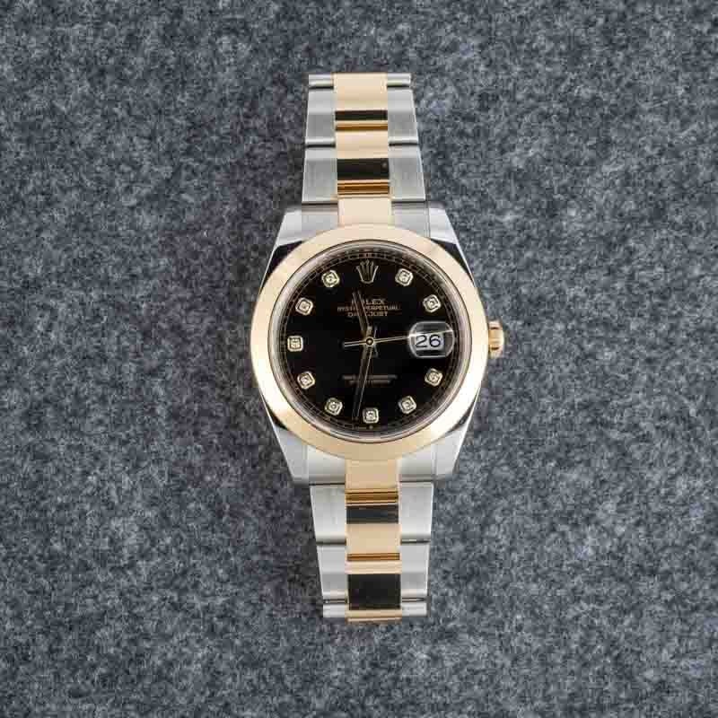 This Rolex Datejust 41 ref 126303 (2020) brings modern luxury to a timeless design with its 41mm stainless steel case and smooth 18k yellow gold bezel. The black dial is set with diamond hour markers, offering a refined contrast and elevated elegance. Fitted with a two tone Oyster bracelet and powered by the reliable Rolex Caliber 3235, this piece delivers both visual impact and precision performance.