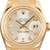 This exquisite 26 mm solid 18 k yellow gold Lady‑Datejust features a warm champagne dial, a distinctive fluted bezel, and is mounted on Rolex’s iconic President bracelet — effortlessly marrying heritage and elegance. Powered by the automatic calibre 2235, it delivers precision in a compact, luxurious form. Whether for daily wear or a refined evening out, this model embodies refined sophistication and timeless value.