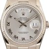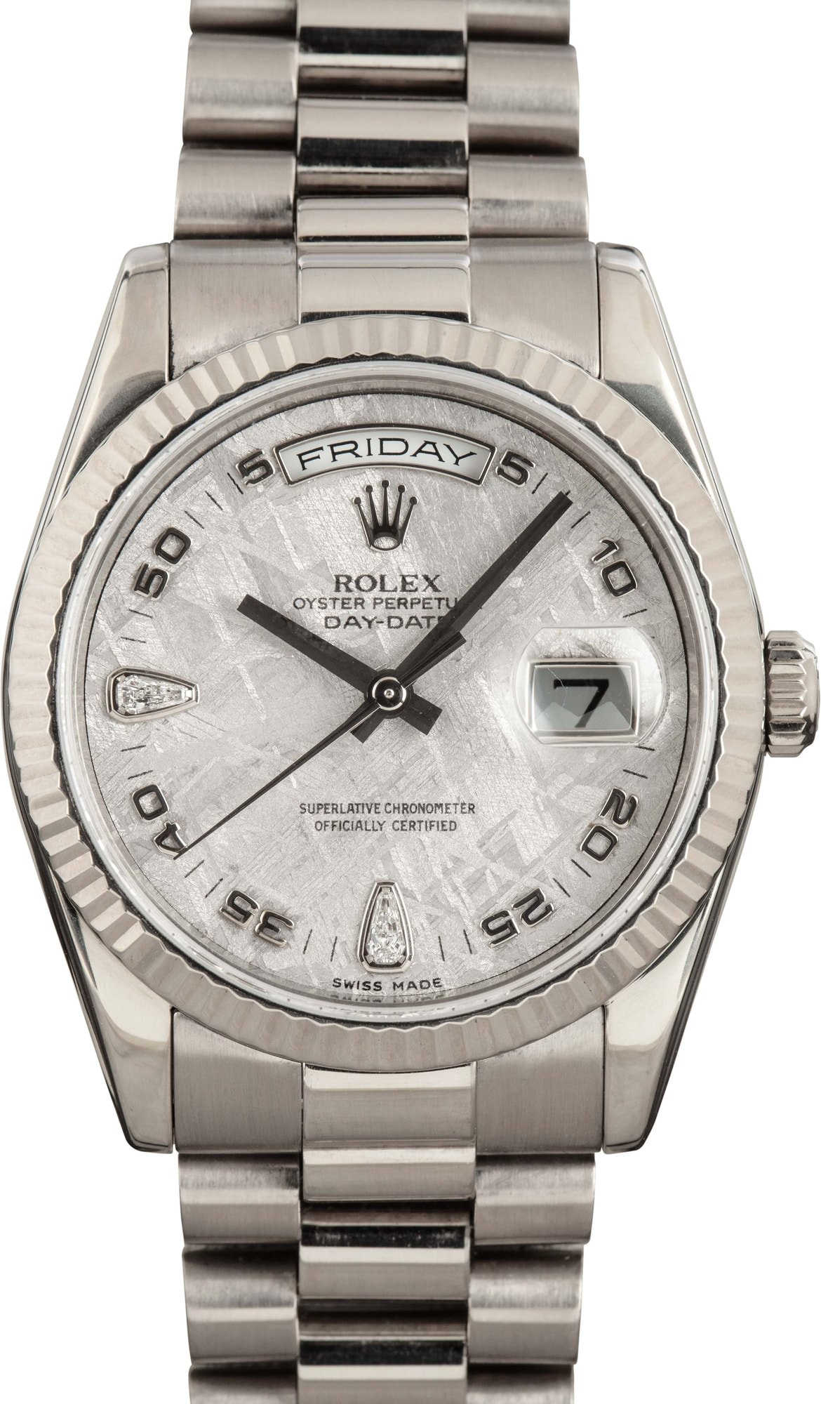This Rolex Day-Date ref. 118239 (2005 – 2006) is a luxurious 36mm timepiece crafted from 18k white gold. It features a striking meteorite dial with Arabic hour markers and diamond accents at 6 and 9 o’clock, complemented by a fluted bezel. Paired with the iconic 18k white gold President bracelet, this watch is powered by the Rolex Caliber 3155, offering both prestige and precision in an elegant design.