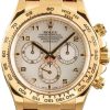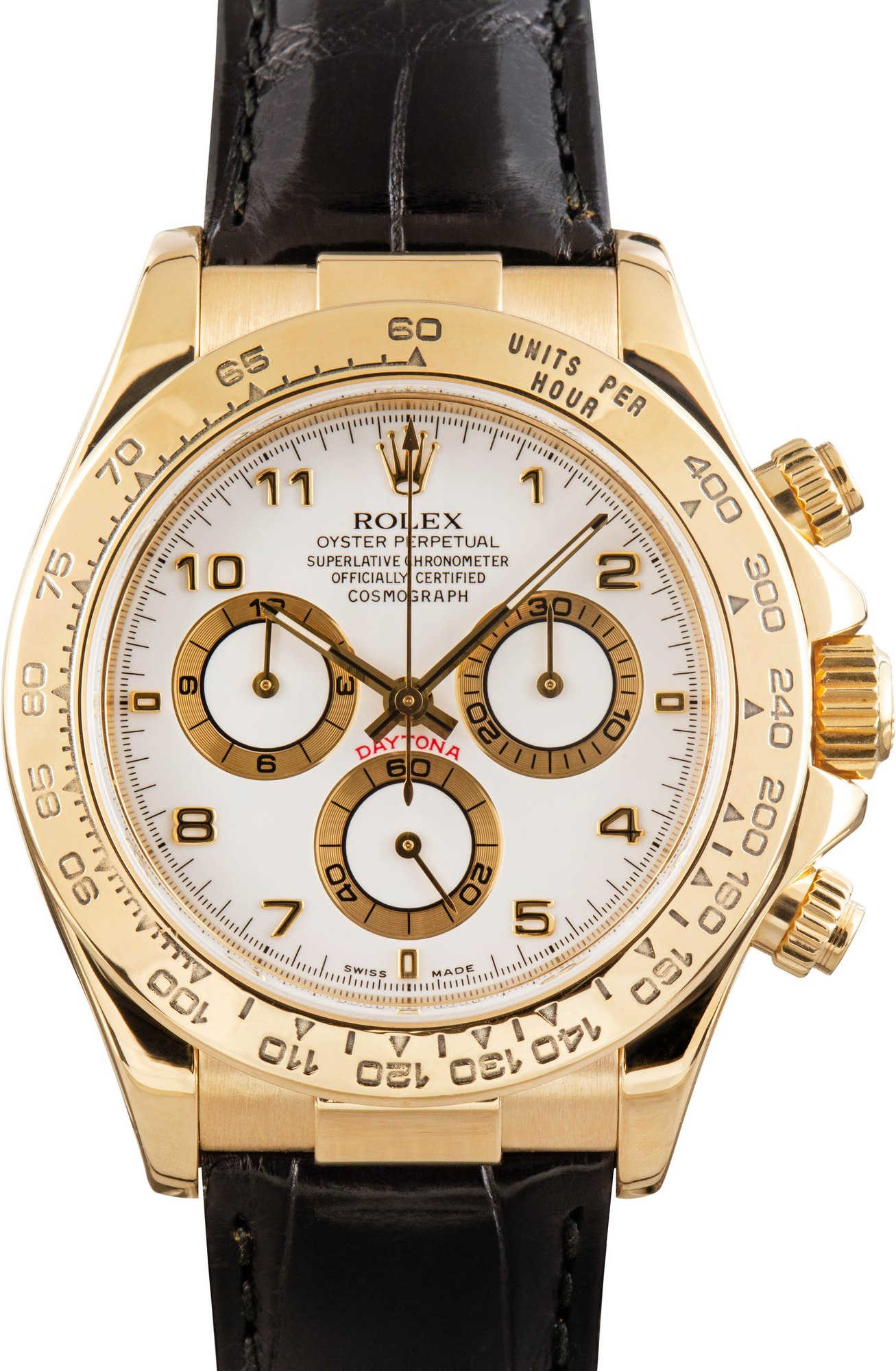 This Rolex Daytona ref. 116518 (2005 – 2006) features a 40mm 18k yellow gold case, complemented by a matching yellow gold tachymeter bezel. The white Arabic dial includes three subdials, ensuring precise chronograph functionality while enhancing the timepiece’s sporty elegance. Paired with a Rolex black leather strap, this model exudes classic sophistication. Powered by the reliable Caliber 4130, this Daytona is a blend of high performance and timeless design.