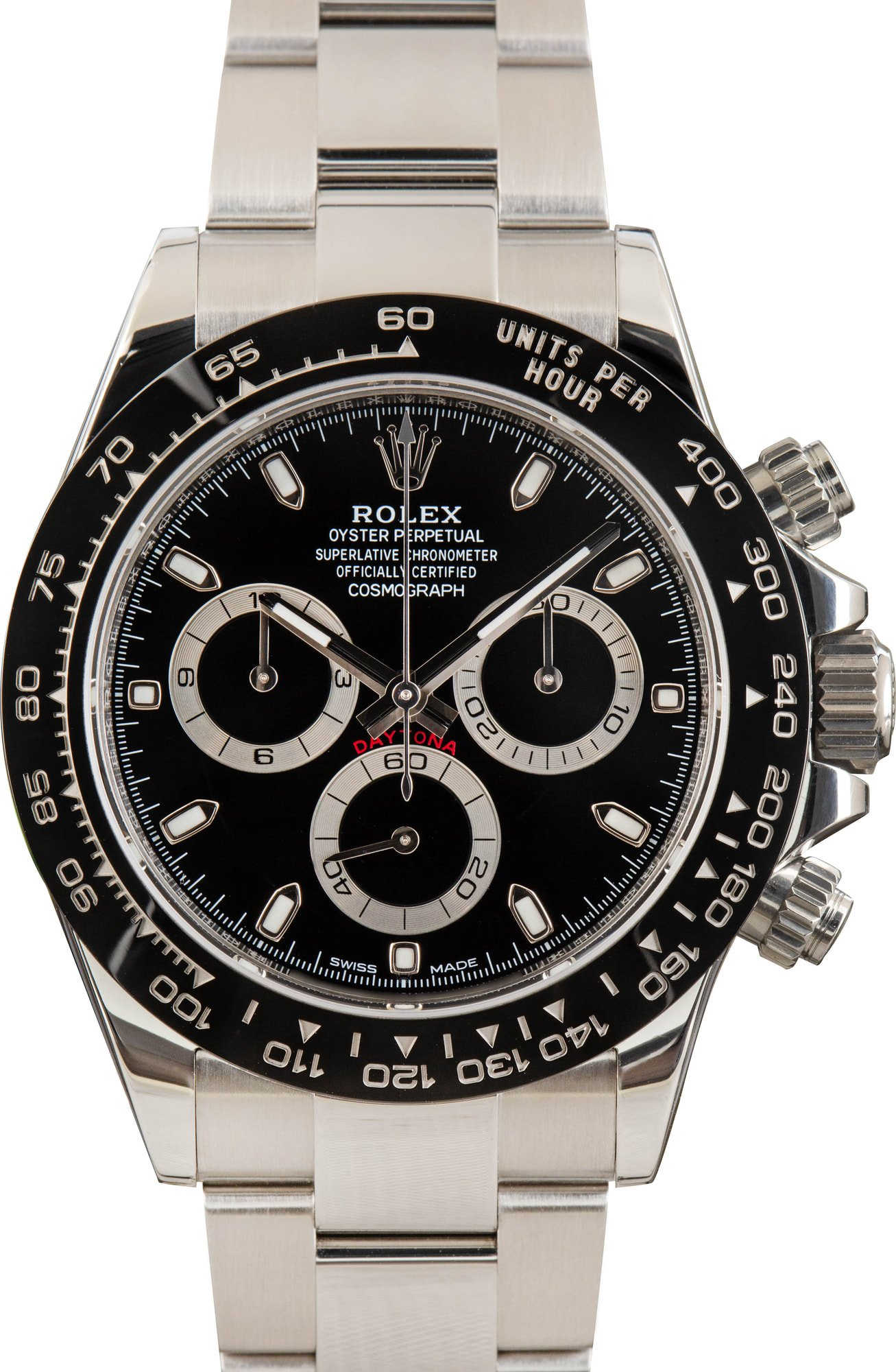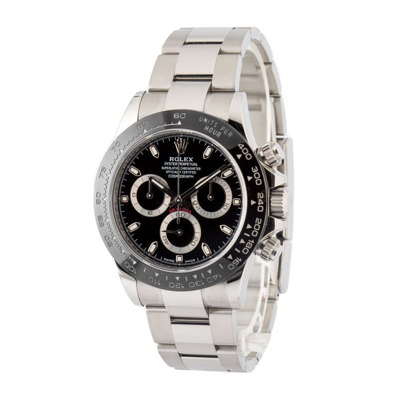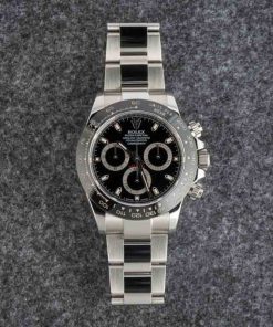 Rolex Daytona ref. 116500 (2019) features a sleek black dial and iconic 40mm stainless steel case. Powered by the Caliber 4130 automatic chronograph movement, it delivers precision timing with a 72-hour power reserve. Paired with a matching Oyster bracelet, this Daytona blends legendary motorsport heritage with modern performance and timeless style.