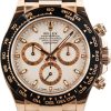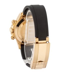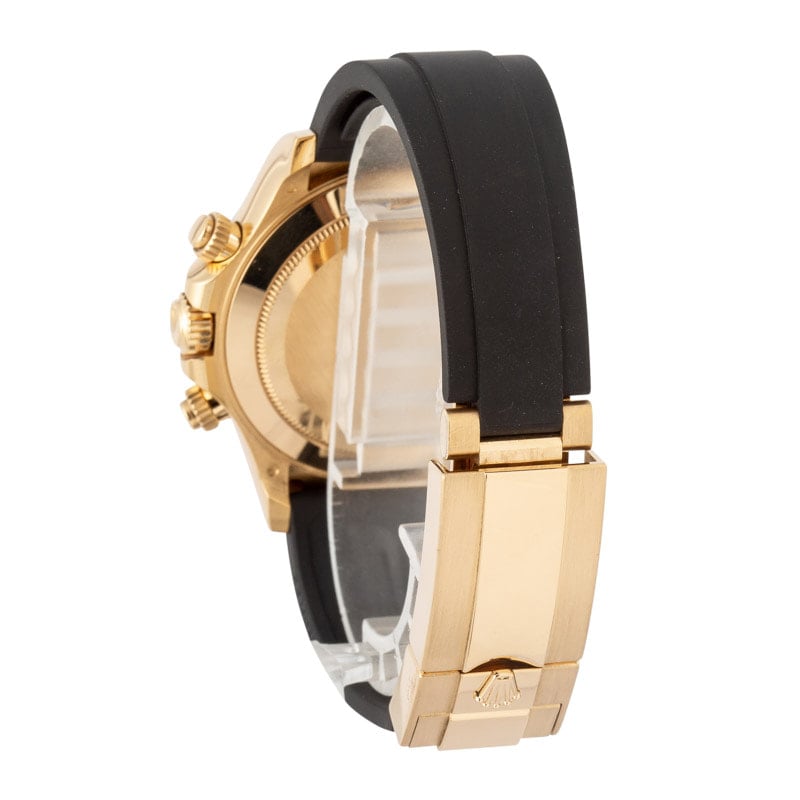 This Rolex Daytona ref. 116518 (2023) pairs luxurious craftsmanship with race-inspired precision. Its 40mm 18k yellow gold case is fitted with a black ceramic tachymeter bezel and a striking black dial set with diamond hour markers and three gold-rimmed subdials. Powered by the in-house Caliber 4130, it delivers chronograph accuracy and a 72-hour power reserve. Completed with a comfortable black Oysterflex bracelet, this Daytona blends performance, style, and exclusivity in true Rolex fashion.