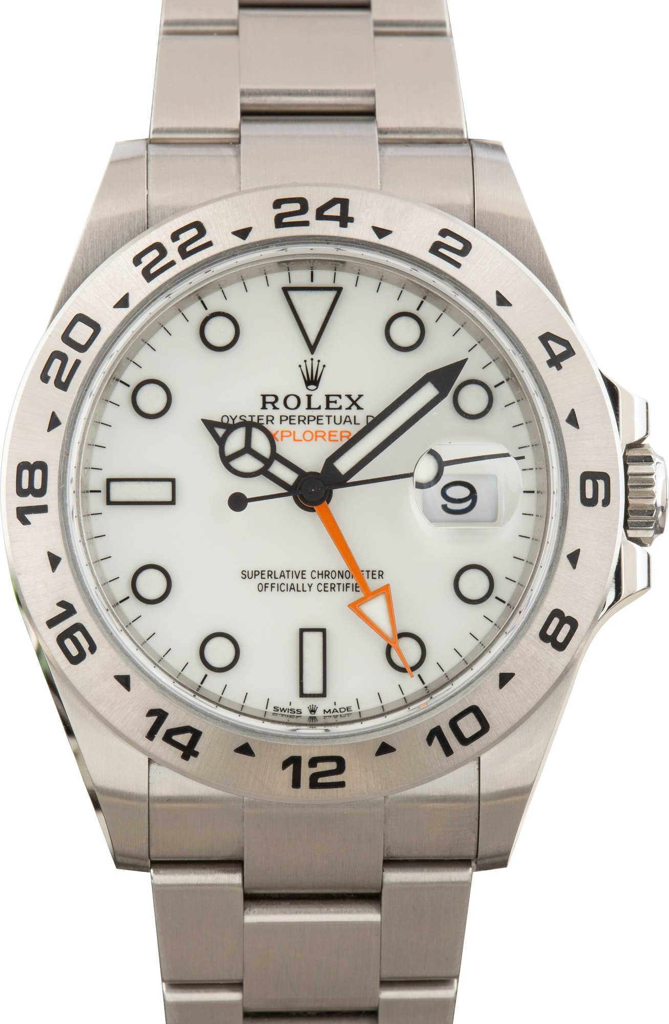This 2025 Rolex Explorer II ref. 226570 features a 42 mm Oystersteel case built for durability and adventure. Its white Chromalight dial with luminous hands and markers ensures exceptional legibility, while Rolex Caliber 3285 powers the watch with a 70-hour power reserve and dual time zone functionality. Finished with a robust Oyster bracelet and water resistance to 100 meters, this Explorer II combines rugged performance with timeless elegance—perfect for explorers and collectors alike.