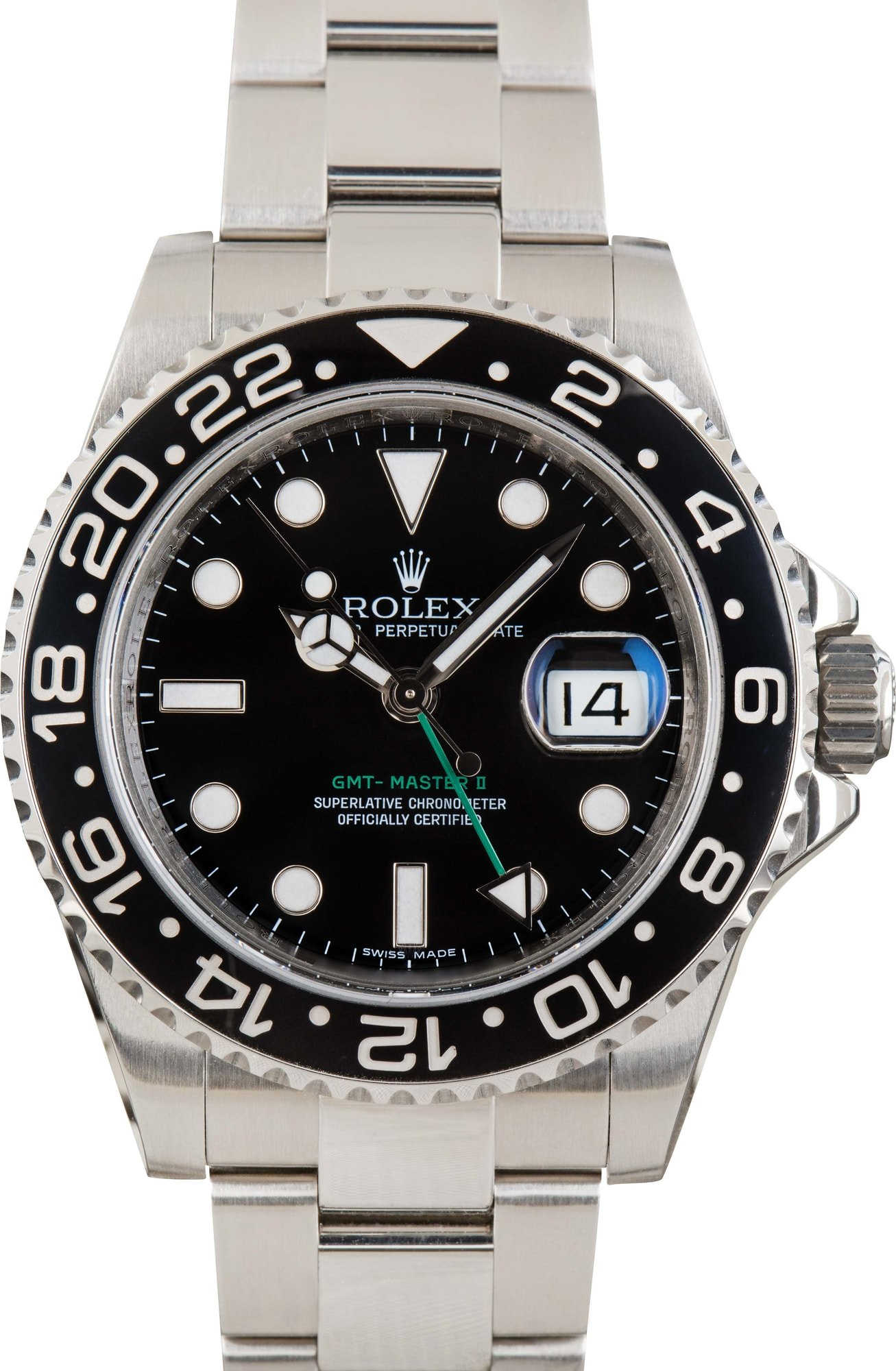 This Rolex GMT-Master II ref. 116710 (2008 – 2009) features a black superluminova dial and a black ceramic bezel, crafted in stainless steel. It comes with an Oyster bracelet and is powered by the 3186 movement, offering a robust and stylish timepiece with dual time zone functionality.