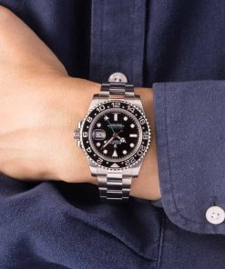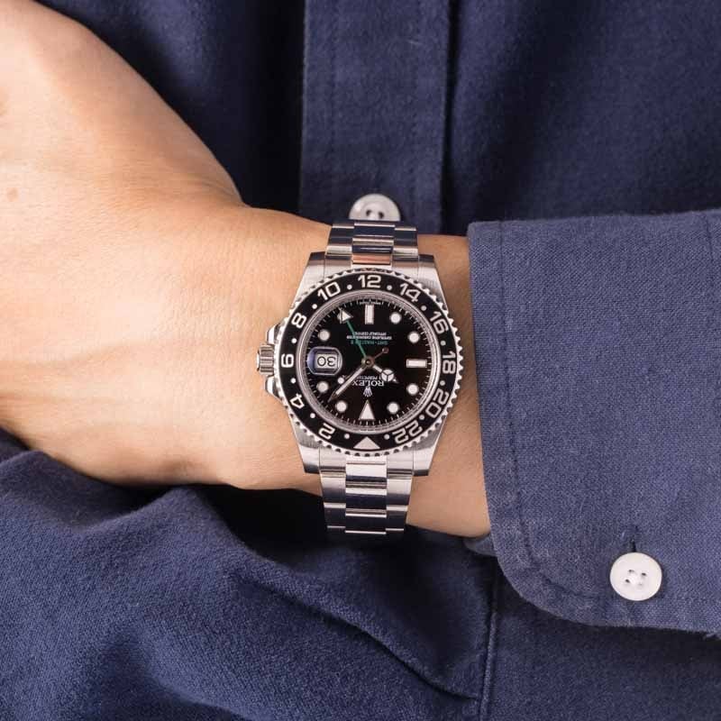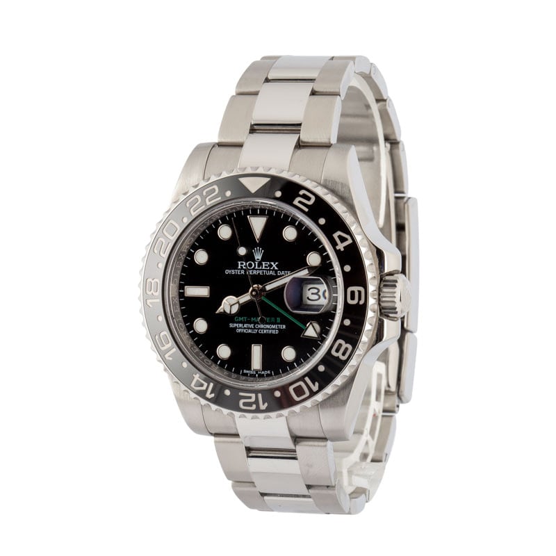 This Rolex GMT-Master II ref. 116710 (2011 – 2019) combines sporty functionality with iconic Rolex design. Featuring a 40mm Oystersteel case, black dial, and scratch-resistant black Cerachrom ceramic bezel, it offers clear legibility with Chromalight luminescent hands and hour markers. Powered by the reliable Caliber 3186 movement, this GMT-Master II includes an independently adjustable 24-hour hand, making it perfect for tracking multiple time zones with ease. A robust Oyster bracelet with Oysterlock clasp completes this versatile and enduring travel companion.