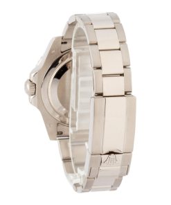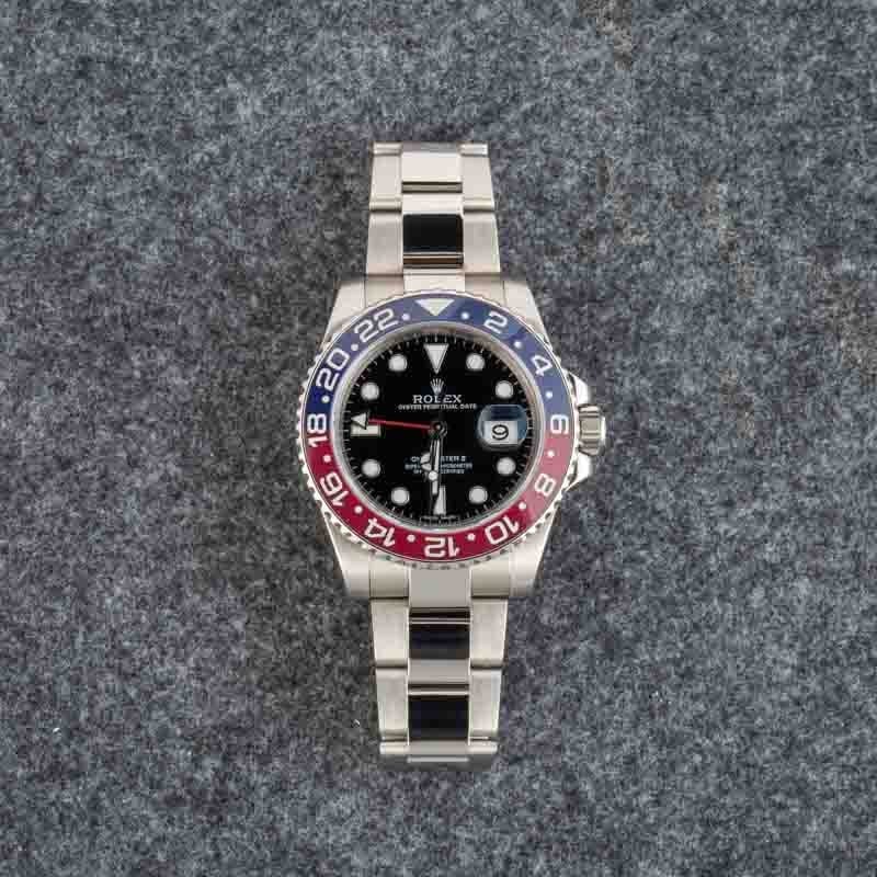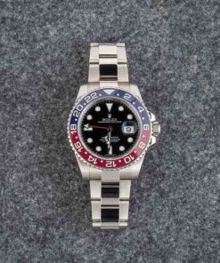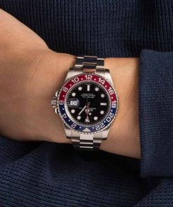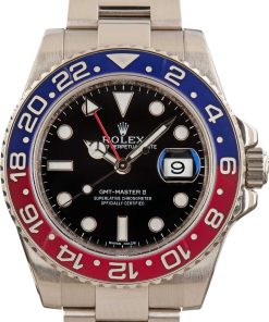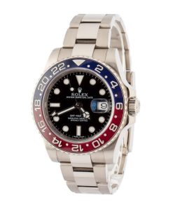This Rolex GMT-Master II ref. 116719 (2014 – 2018) is the epitome of luxury and precision, crafted in stunning 18k white gold. Featuring the legendary “Pepsi” bezel in vibrant red and blue ceramic, complemented by a sleek black dial, this timepiece seamlessly combines iconic design with exceptional functionality. Powered by the reliable Rolex Caliber 3186 movement, it offers dual time zone capabilities, making it the perfect companion for the discerning world traveler. A true masterpiece, this GMT-Master II is a sophisticated fusion of style, performance, and timeless elegance.