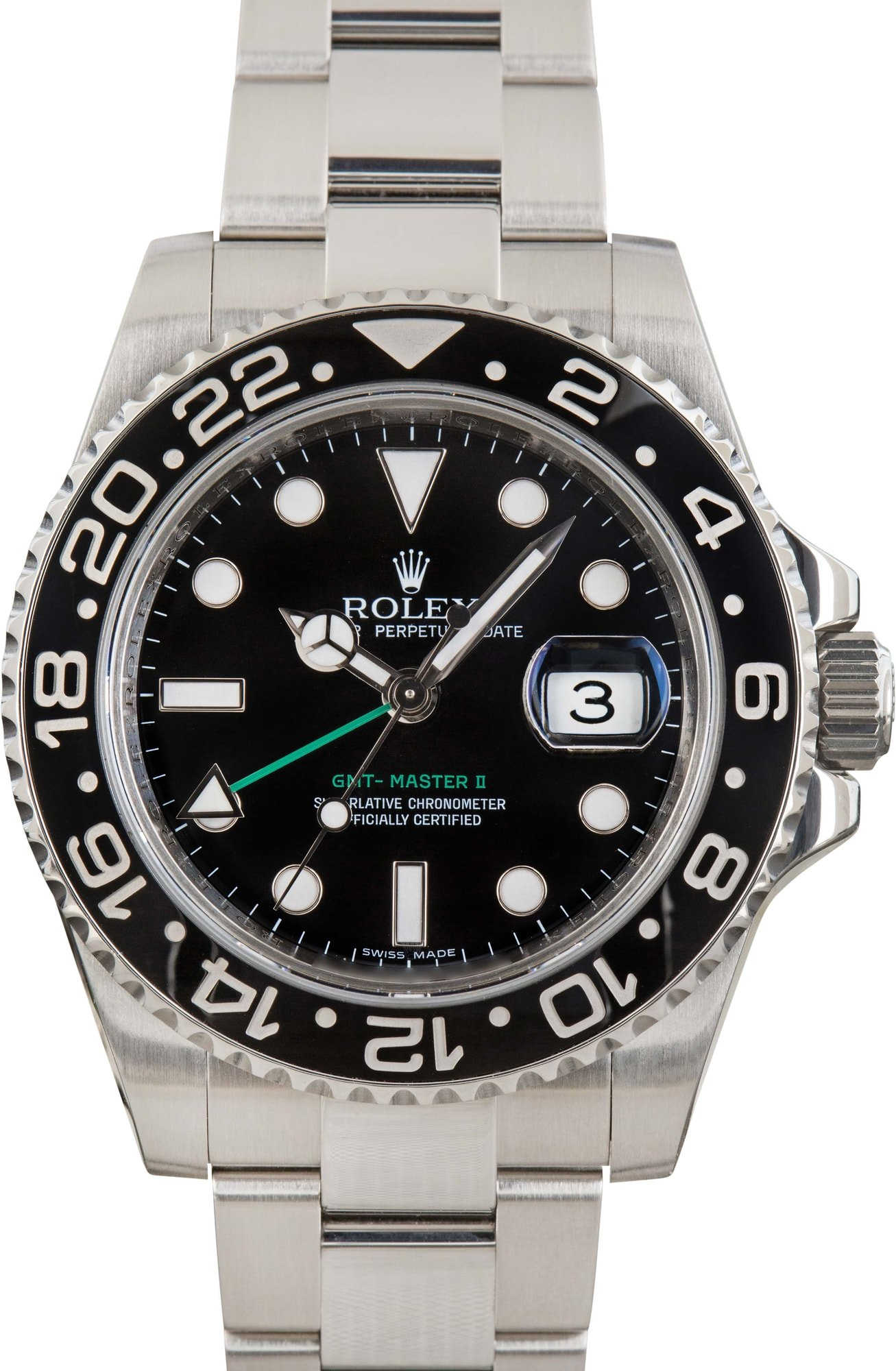 Rolex GMT-Master II ref. 116710 (2009) exudes rugged precision and iconic style. Featuring a 40mm Oystersteel case, black Cerachrom bezel, and black dial, this GMT-Master II offers clear visibility with Super-LumiNova luminescent hands and hour markers. Powered by the Caliber 3186 automatic movement, it includes an independently adjustable 24-hour hand for tracking multiple time zones with ease. Equipped with a screw-down Triplock crown, COSC-certified movement, and a robust Oyster bracelet with Oysterlock clasp, this timepiece combines durability, performance, and classic Rolex design for any adventure.